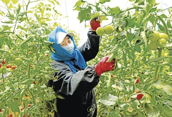木缽鎮(zhèn)關(guān)營村現(xiàn)代農(nóng)業(yè)產(chǎn)業(yè)園大棚里,農(nóng)戶采摘成熟的西紅柿。 慶陽融媒記者 郭海霞攝