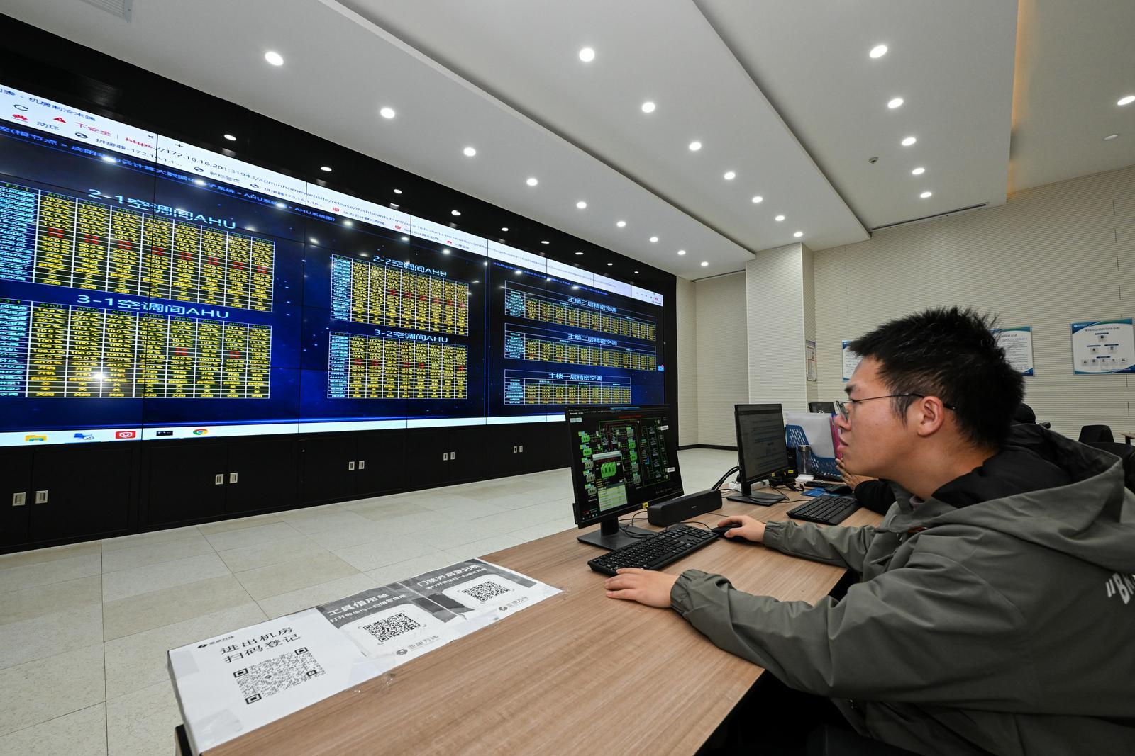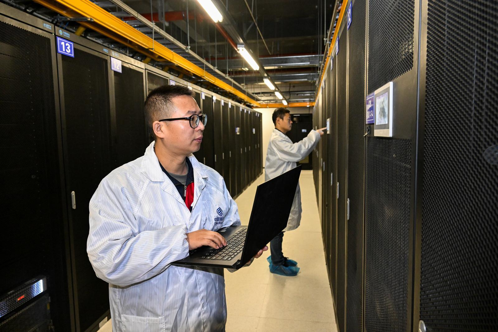 中國移動(甘肅·慶陽)綠色智算中心,技術(shù)人員在IDC機房檢查設備運行情況。慶陽融媒記者 俄少飛 攝