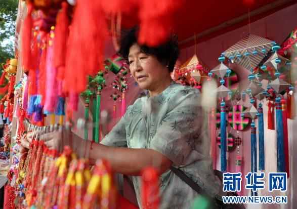5月29日,市民在甘肅省慶陽(yáng)市西峰區(qū)的集市上選購(gòu)香包。新華網(wǎng)發(fā)(劉欣瑜 攝)
