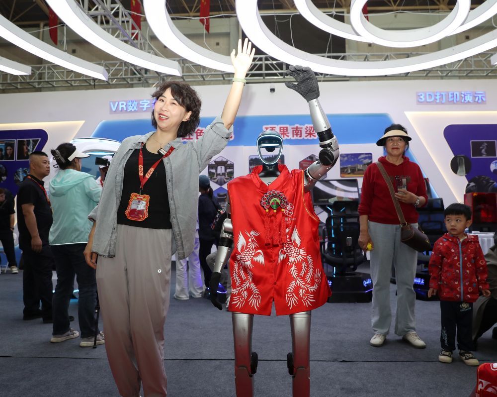 智慧文旅館中,機器人、機器狗身著剪紙服飾走秀展演,南梁紅色研學VR沉浸式體驗等項目,吸引了大量游客駐足互動。