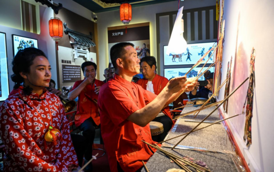本屆香包節(jié)上,36歲的“聾啞繡娘”袁丹丹用手語(yǔ)和打字的方式,向游客訴說(shuō)著她對(duì)慶陽(yáng)香包的熱愛(ài),其師傅左煥茸耗時(shí)一年多完成的長(zhǎng)11米、寬0.5米的刺繡長(zhǎng)卷《千里江山圖》吸引了大量游客駐足。環(huán)縣道情皮影戲非遺代表性傳承人許明堂在節(jié)會(huì)現(xiàn)場(chǎng)演出經(jīng)典戲目《盜仙草》,皮影的上下翻飛加上他高亢洪亮的唱腔,引得臺(tái)下觀眾陣陣掌聲。慶陽(yáng)剪紙非遺代表性傳承人馬路現(xiàn)場(chǎng)展示技藝,剪刀翻飛之間,一張剪紙側(cè)影就浮現(xiàn)了出來(lái)……