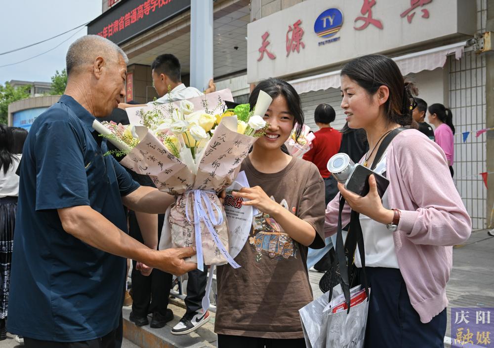 家長(zhǎng)為結(jié)束“首戰(zhàn)”的考生遞上鮮花以示鼓勵(lì)。