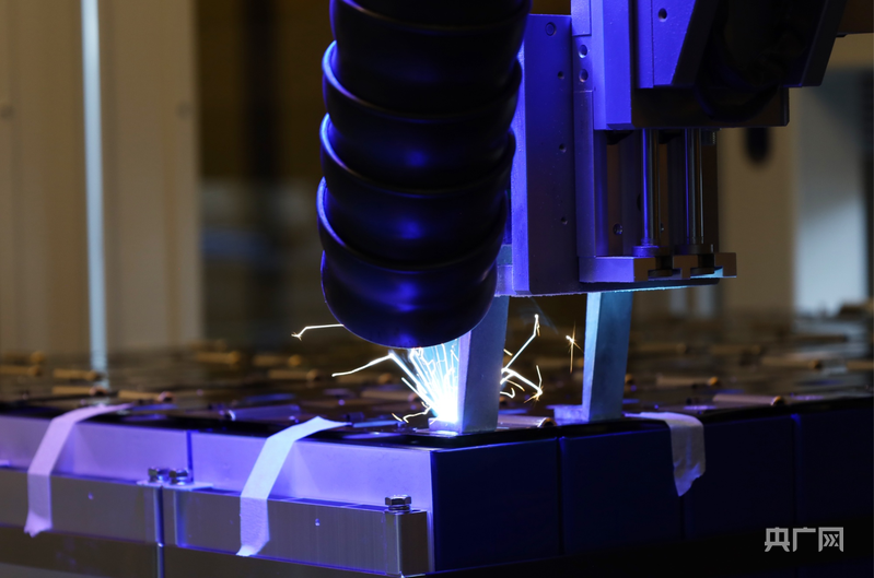 在易事特?cái)?shù)字裝備制造(環(huán)縣)有限公司廠房?jī)?nèi),全自動(dòng)機(jī)械臂正在進(jìn)行智能焊接作業(yè)(央廣網(wǎng)記者 李紅軍 攝)