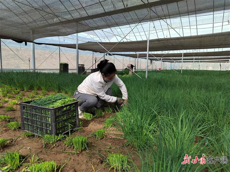 甘肅聚廣利現(xiàn)代設(shè)施蔬菜種植基地工人收割成熟的香蔥。