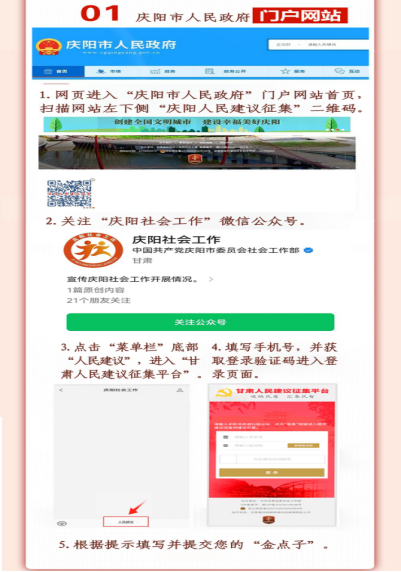 線上渠道。建議人可通過掃描慶陽市人民政府門戶網(wǎng)站“慶陽人民建議征集”二維碼飄窗,或關(guān)注“慶陽社會(huì)工作”微信公眾號(hào),通過“人民建議”窗口提交建議。