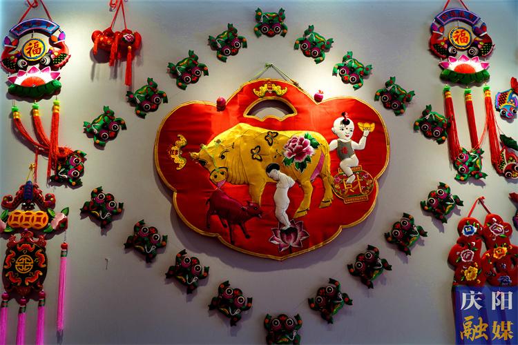 碎花布做底的五毒肚兜古樸又美觀,金線勾勒的金元寶上耕?;铎`活現(xiàn),草綠色緞面的牡丹花千嬌百媚……轉(zhuǎn)角處的榮譽墻展區(qū),不同年齡的繡娘們用褪色的頂針磨出了香包刺繡的歲月印記。