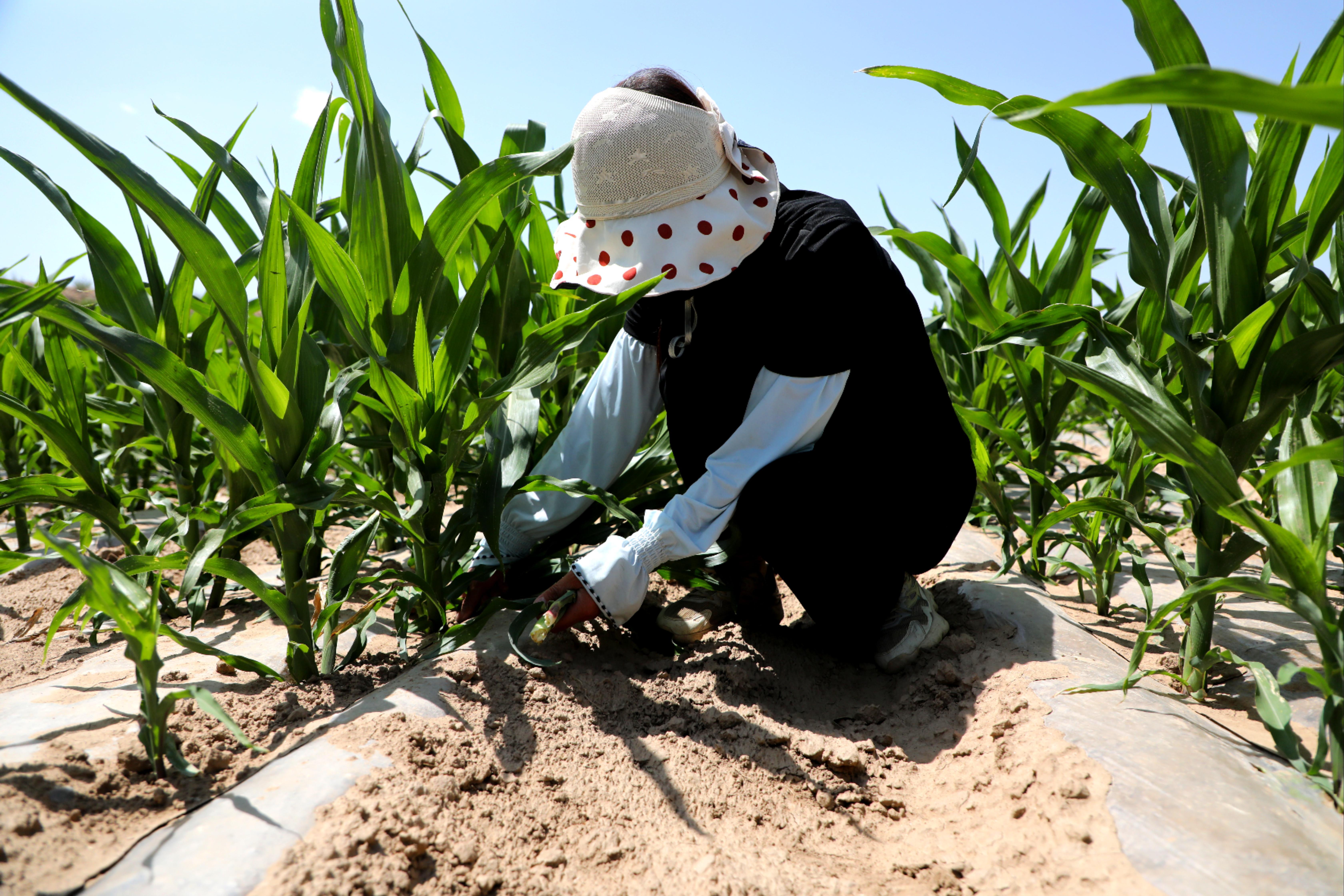 盡管烈日炎炎,但譚彩霞依然手持鋤頭,在玉米行間穿梭忙碌著。她或彎腰或蹲地,熟練地給玉米打拐,為后續(xù)的追肥工作做著充分的準(zhǔn)備。汗水浸濕了她的衣衫,但她的臉上卻洋溢著滿足和幸福的笑容。