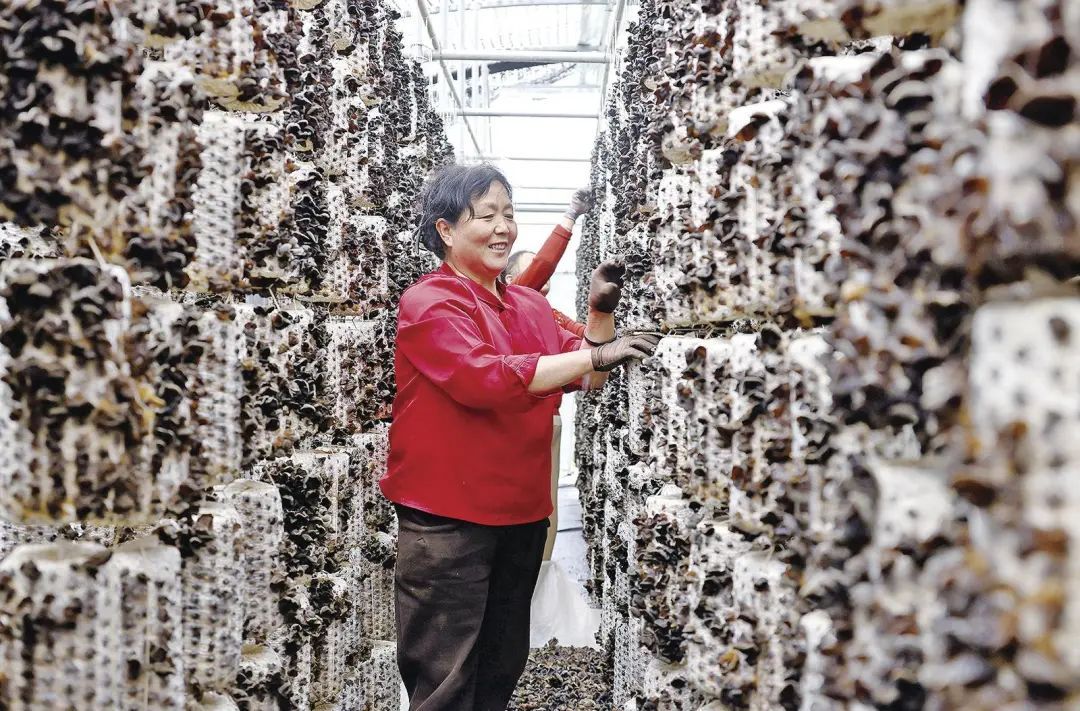 彭原鎮(zhèn)鄢旗坳村黑木耳菌種選育基地內(nèi),工人在采摘木耳。 慶陽融媒記者 盤小美 攝