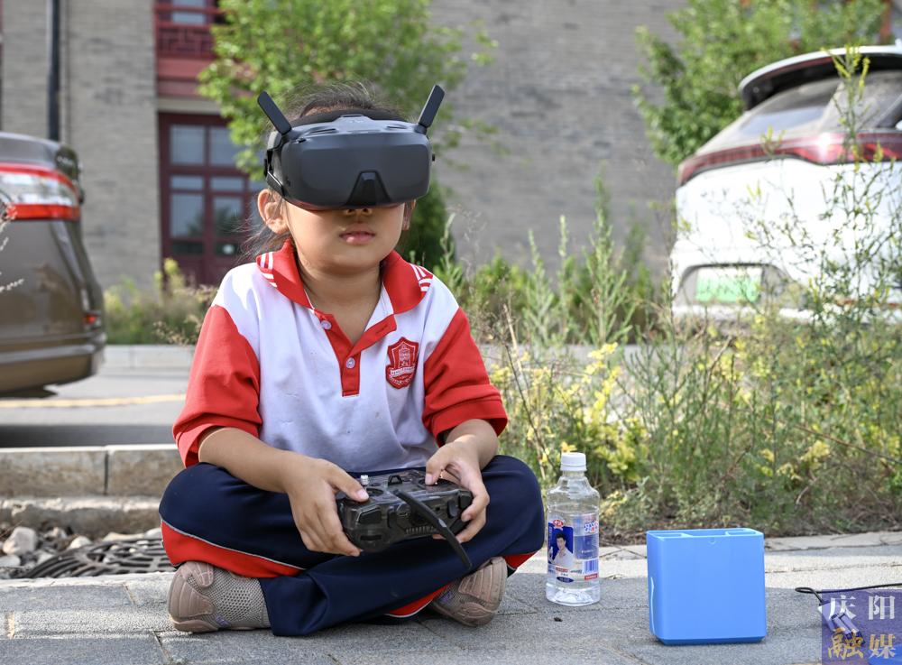 小朋友體驗(yàn)穿越機(jī)飛行。