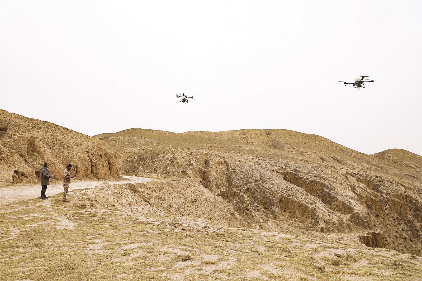 甜水鎮(zhèn)魯掌村土壤和草原改良項(xiàng)目現(xiàn)場,技術(shù)人員操作農(nóng)業(yè)植保無人機(jī)作業(yè)。 慶陽融媒記者 喬潔 攝