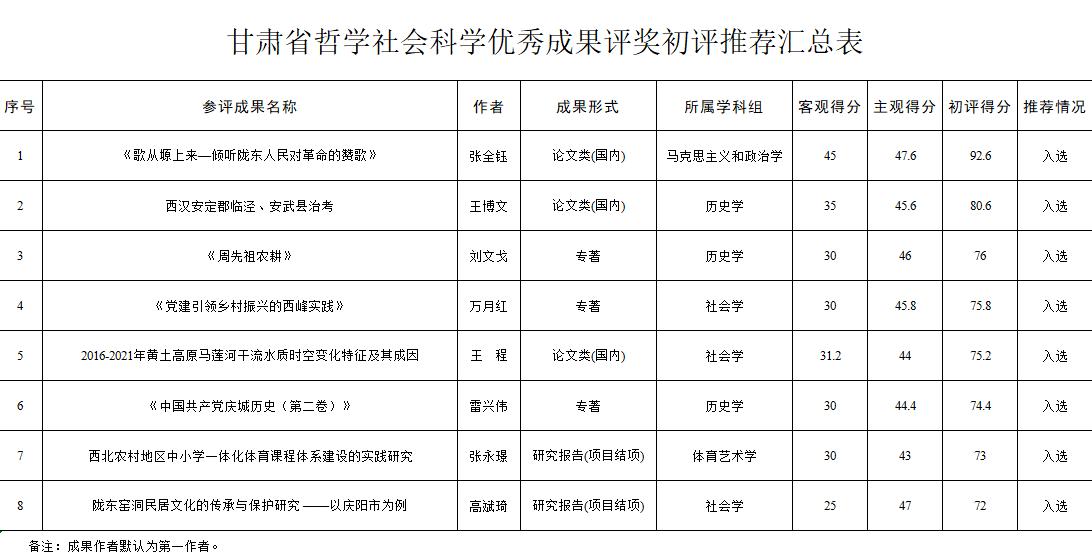 按照《甘肅省第十八屆哲學(xué)社會(huì)科學(xué)優(yōu)秀成果評(píng)獎(jiǎng)實(shí)施細(xì)則》要求,現(xiàn)將擬推薦參加省第十八屆哲學(xué)社會(huì)科學(xué)優(yōu)秀成果評(píng)獎(jiǎng)復(fù)評(píng)環(huán)節(jié)的8項(xiàng)成果予以公示,接受社會(huì)各界和廣大社科理論工作者監(jiān)督。