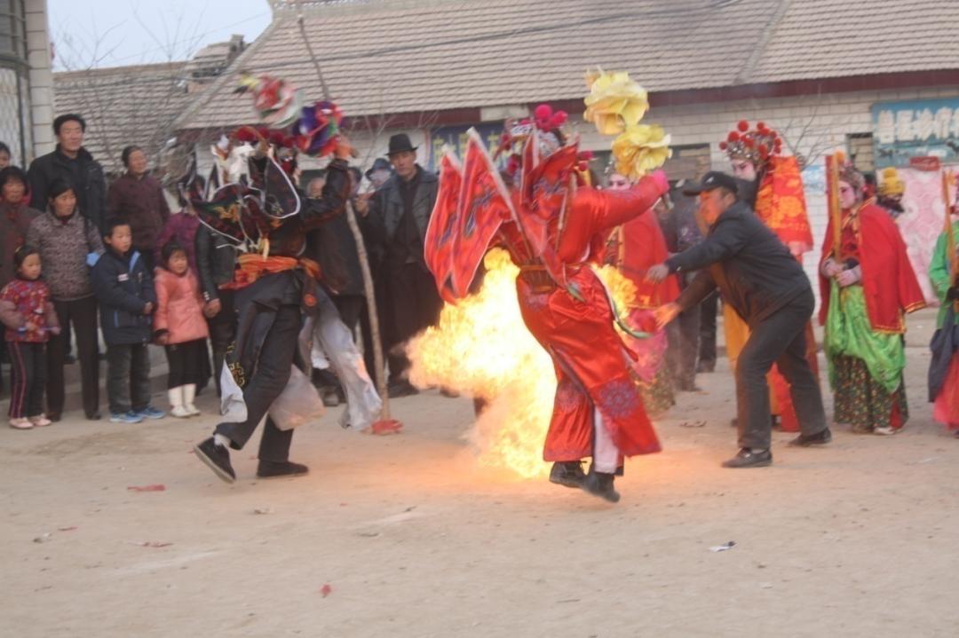 寧縣社火表演藝術(shù)是寧縣古老民間藝術(shù)表演形式之一,分布在寧縣各鄉(xiāng)鎮(zhèn),具體表現(xiàn)形式隨寧縣地域不同而大同小異。寧縣社火表演藝術(shù)誕生于農(nóng)耕文化中,藝術(shù)表現(xiàn)力強,造型粗獷,表演內(nèi)容多樣,多以民間傳說故事、歷史典故、戲劇故事及神話故事為主,配以戲劇服飾,以夸張或者詼諧的形式進行演繹。寧縣社火表演表現(xiàn)形式豐富,分為秧歌舞、車故事、馬故事、地故事及彩車方隊等。 寧縣社火表演藝術(shù)究其源頭,可以追溯到遠古時期,它與農(nóng)耕文化中的原始歌舞息息相關(guān)。刀耕火種的遠古時期,社會生產(chǎn)力極其低下,原始先民們對于生死及許多自然界現(xiàn)象不能正確理解,常常以社為單位組織祭祀活動,舉行相關(guān)表演和儀式,“擊器而歌,圍火而舞”,祈求來年風(fēng)調(diào)雨順、莊稼豐收,故稱社火。每逢祭祀的時節(jié),原始先民會編排程式固定的舞蹈進行祭祀活動,把本族信仰的天神、圖騰畫在臉上或者制成面具,戴上頭上,邊擊打著勞動生產(chǎn)器具,邊狂呼狂舞,祈望崇拜的天神、圖騰能夠保佑人們免災(zāi)避禍。夏商時期,這種傳統(tǒng)祭祀儀式被稱為“大儺”。奴隸社會時期的朝廷為了普化眾生,祈求國泰民安,設(shè)有專門從事祭祀儀式的機構(gòu),使這種帶有巫術(shù)性的舞蹈普遍流傳?!稑犯s錄》記載“驅(qū)儺用方相氏,四人戴冠及面具,黃金為四目,衣熊裘,執(zhí)戈揚盾,口唱巫術(shù)咒語,在室內(nèi)到處亂打,以使鬼懼怕而逃遁”。隨著歲月的流逝,經(jīng)朝歷代,這種驅(qū)儺由宮廷傳入民間,逐漸形成民間傳統(tǒng)的民俗禮儀活動。“文化大革命”時間,社火表演被禁演,部分演出劇目失傳。直到20世紀(jì)80年代得到恢復(fù),一直沿襲至今。 寧縣社火表演內(nèi)容豐富,形式多樣,按表演形式主要分為車故事、秧歌、馬故事、地故事、高蹺、彩車游行等方隊。 1.車故事 車故事通常以車為載體進行表演,將車用彩綢紙花裝飾,用木椽在車上搭成亭臺及樓閣架子,用花布紅綢和明鏡絲穗裝飾一新,演員著傳統(tǒng)戲曲服裝,多位傳統(tǒng)秦腔折子戲片段的扮相,如《花亭相會》《關(guān)公?;噬贰度锝套印返?,內(nèi)容多以懲惡揚善,忠孝仁義為主,飽含中國傳統(tǒng)文化的精髓。 2.高蹺 高蹺表演者兩腿各踏一根三、四尺高的木腿,翻跟斗、劈叉,跑跳自如。演出時,臉譜與服飾會事先扮好,在鑼鼓伴奏下,做行進隊列或固定場地表演,驚險出奇,扣人心弦。常演的劇目有《盜仙草》《唐僧取經(jīng)》《破寧州》《八仙過?!返取?/p> 3.秧歌 寧縣徒手秧歌,俗稱“扭秧歌”,屬于社火隊中集體性的表演活動形式,其最大特點是演員赤手空拳,不拿任何道具,表演形式難度較大。秧歌只舞不歌,始終突出一個“扭”字,腳踏十字步,表演時需變換各種隊形,聚散分合,動靜有序,也有手持花扇、手帕,腰中束紅綠彩帶,邊走邊扭。 4.地故事 地故事又叫“跑故事”,是晚間社火的主要表演形式。以“進單位、入農(nóng)家、走廣場”的方式,走街串巷進行巡回演出,驅(qū)邪求福,給人民群眾送去平安與祝福。演出時,春官依據(jù)演出現(xiàn)場環(huán)境、觀眾身份屬性等,即興發(fā)揮,隨著鼓點隨口編唱祝福賀詞。故事人物裝扮后,按情節(jié)列隊碎步靸地跑動,以“踢尖腳”、“跌平叉”等武功動作出場、入場,隨時變換隊形,有“辮蒜”、轉(zhuǎn)“8”字、“踩五角”、“跑四門”等套路。地故事所到之處,爆竹聲聲,鑼鼓喧天,氣氛熱烈,熱烈異常。 跑旱船、大頭娃娃是傳統(tǒng)地故事中常見的表演形式,船體用竹片扎成,外用彩紙裱糊,艙外懸掛各色彩燈,船身用布或綢子圍著。女角穿戲裝駕船,碎步快走,如燕穿柳。除駕船女角外,每船另有一男角艄公,老生扮相,劃出逆水、轉(zhuǎn)彎、遇風(fēng)浪等動作時,女角要駕船做出翻跟斗、豎蜻蜒、蝎子爬等舞姿,整個表演動作歡快,配合默契。大頭娃娃,演耍起來,動作笨拙,滑稽詼諧,妙趣橫生。 5.彩車游行 彩車游行是傳統(tǒng)社火表演藝術(shù)的衍生物,十九世紀(jì)90年代才開始興盛。演出主體一般以單位,企業(yè)為主,裝扮彩車進行巡游。車上制作各種立體造型或大或小的彩模。彩車以傳統(tǒng)圖案為主,用各色絲綢、布料裝飾,邊角飾以彩穗,或者題寫詩文,立意新穎,深受當(dāng)?shù)厝嗣袢罕姷南矏邸?/p> 2013年6月“寧縣社火表演”被慶陽市人民政府公布列入第三批市級非物質(zhì)文化遺產(chǎn)名錄項目。