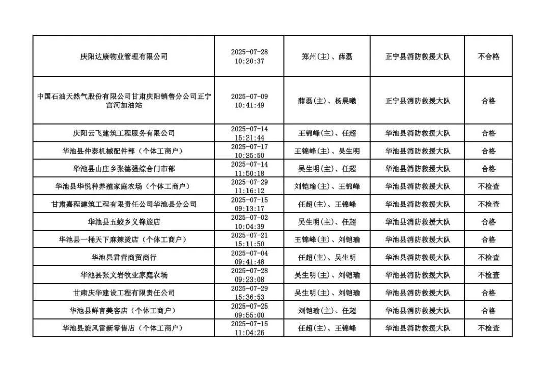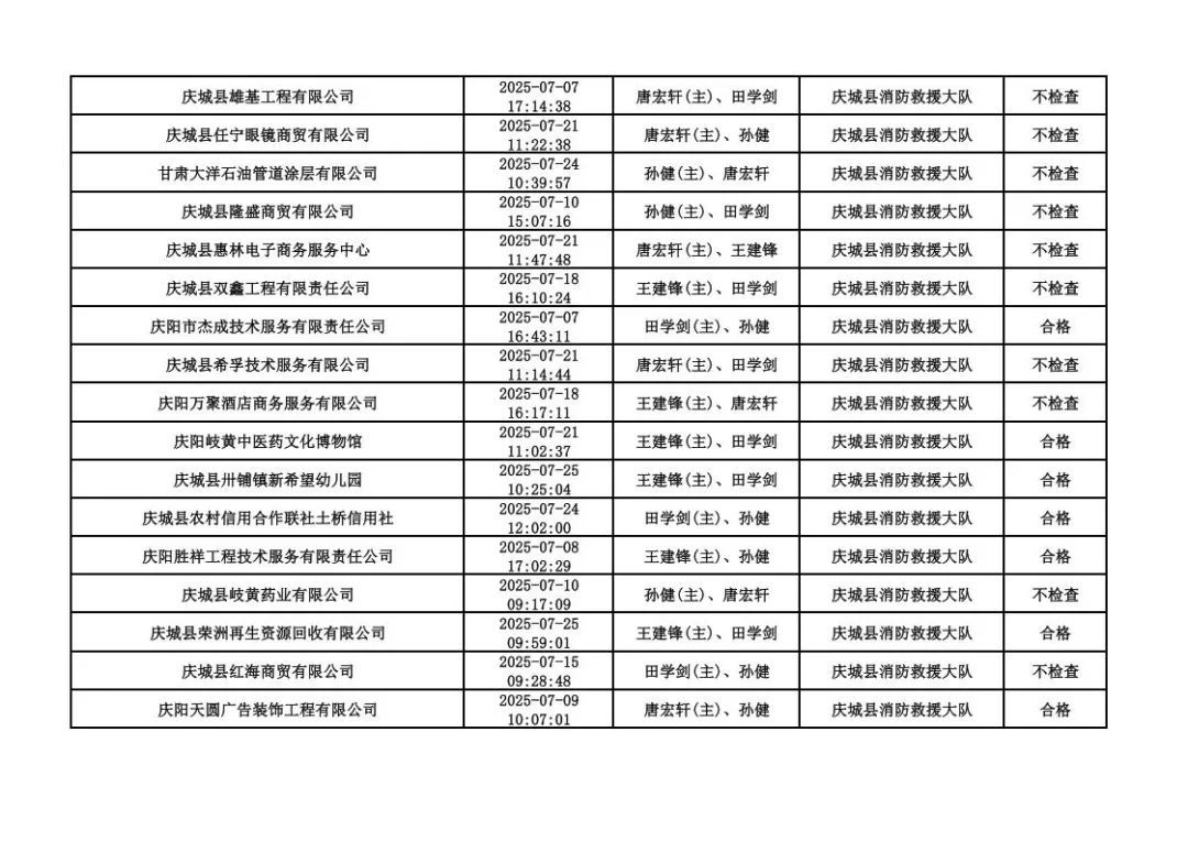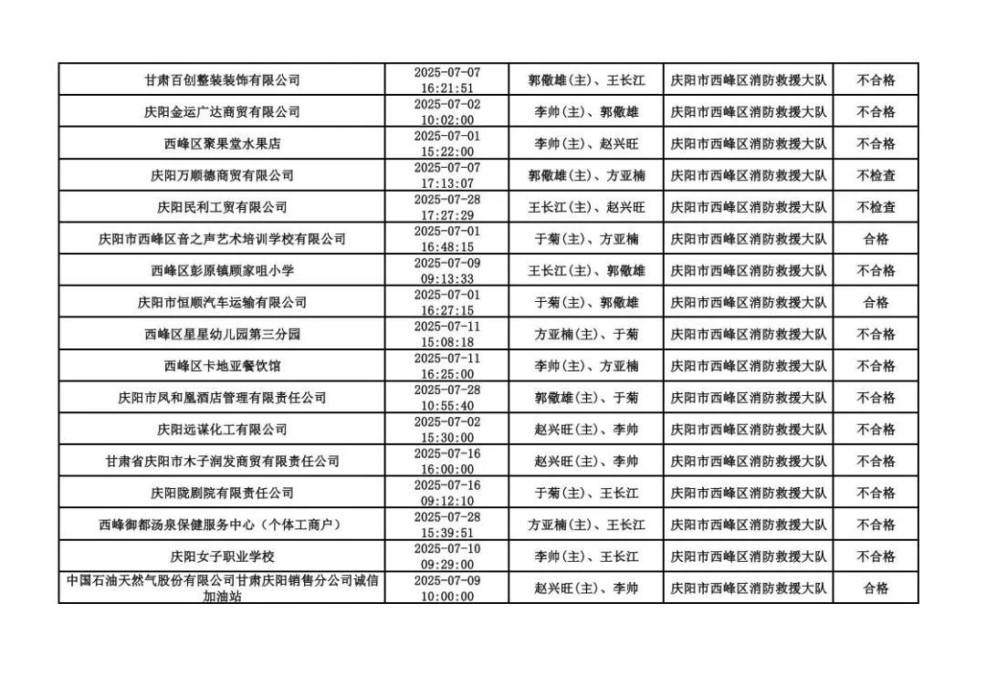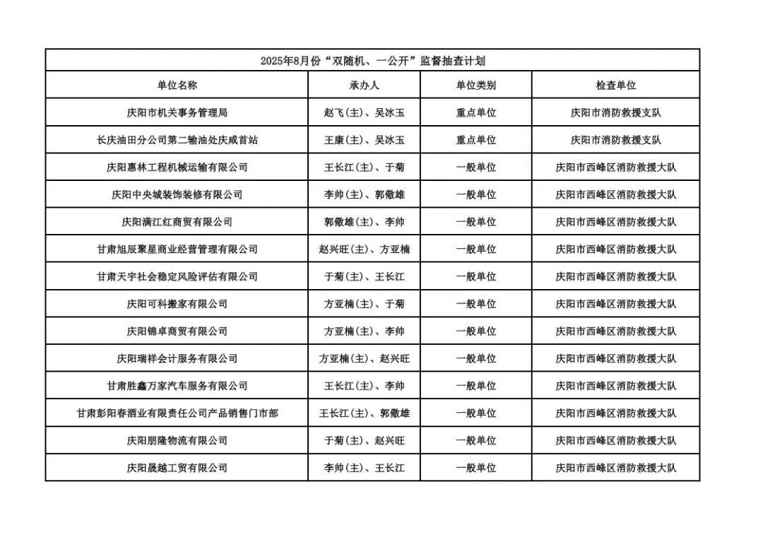 為貫徹落實《消防救援局關(guān)于全面推行“雙隨機、一公開”消防監(jiān)管工作的通知》(應(yīng)急消〔2019〕241號),認真組織實施“雙隨機、一公開”消防監(jiān)管工作,現(xiàn)將2025年7月份“雙隨機、一公開”消防監(jiān)督檢查結(jié)果及2025年8月份監(jiān)督抽查計劃公示如下: