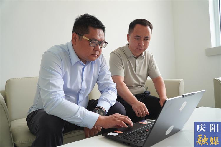 ▲慶陽市住房公積金管理中心招商工作人員(右)與慶陽數(shù)維時空科技有限公司運營方負責人查看項目施工設計圖。