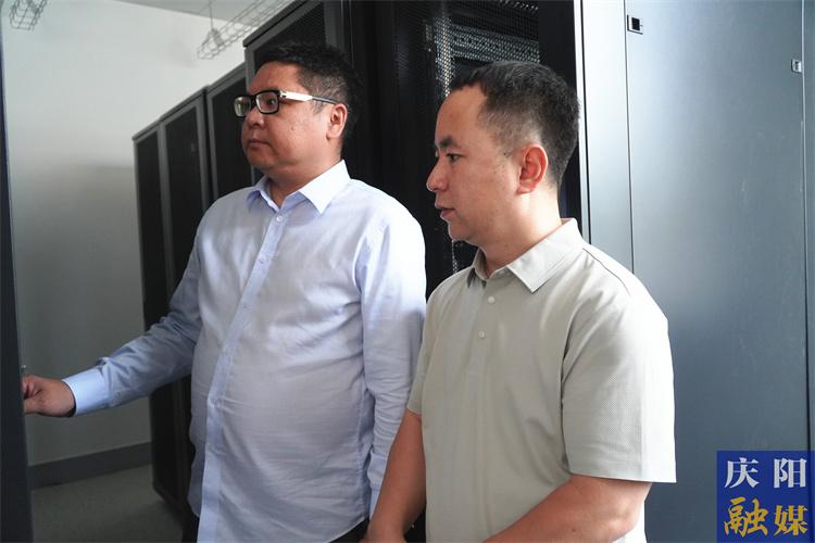 ▲慶陽市住房公積金管理中心招商工作人員(右)與慶陽數(shù)維時空科技有限公司運營方負責人查看已購置的機柜。