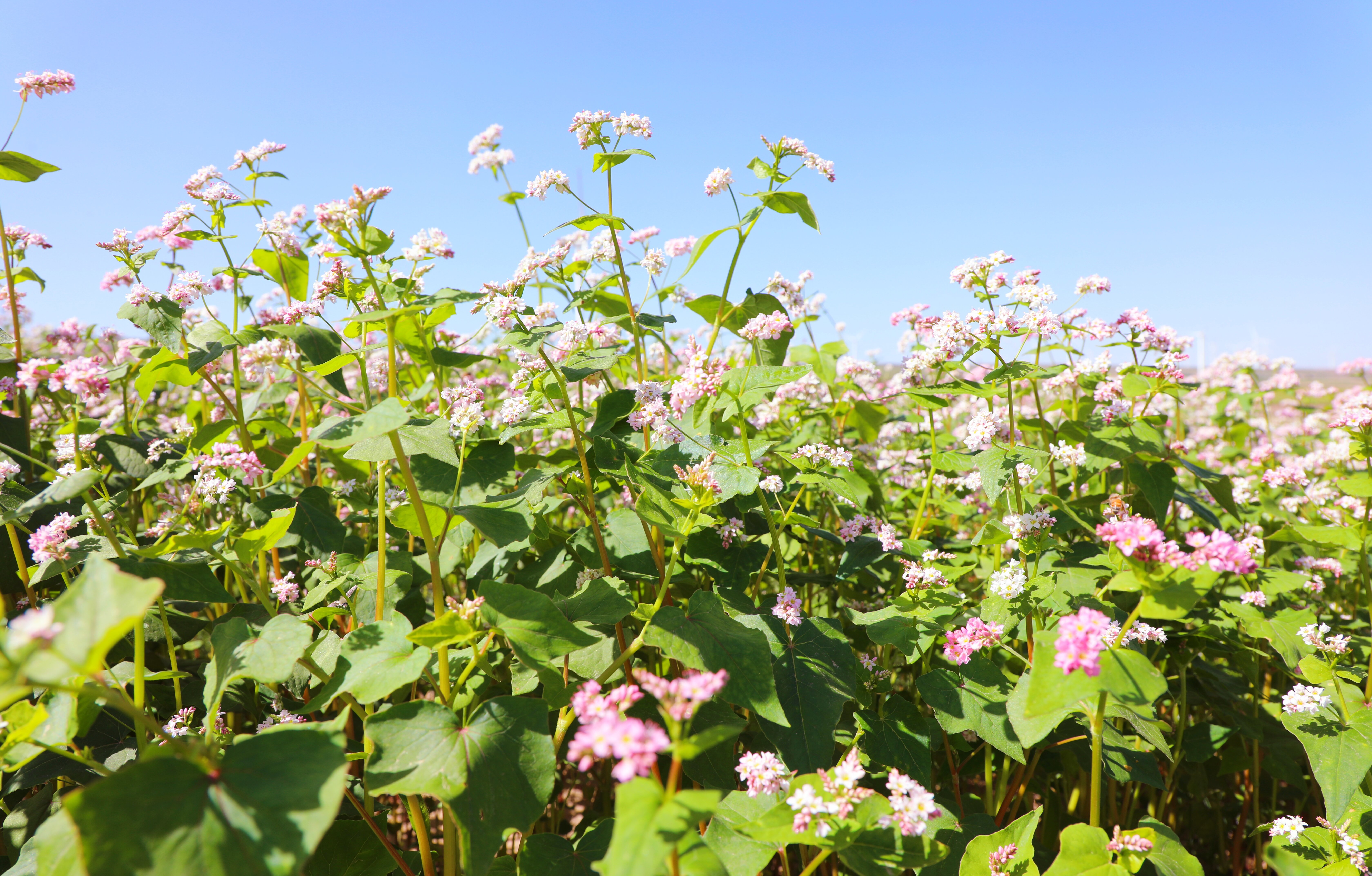 走進(jìn)南湫鄉(xiāng)代家洼萬畝蕎麥種植示范點(diǎn),眼前的景象更顯壯闊:白色與粉色的花朵交織綿延,似云霞飄落又若錦緞鋪地。成群蜜蜂沉醉其間,“嗡嗡嗡”地來回穿梭;遠(yuǎn)處群山起伏,大風(fēng)車悠然轉(zhuǎn)動(dòng),羊群低頭啃食青草,與蕎麥花海相映成景,勾勒出一幅清新柔美的山野畫卷。