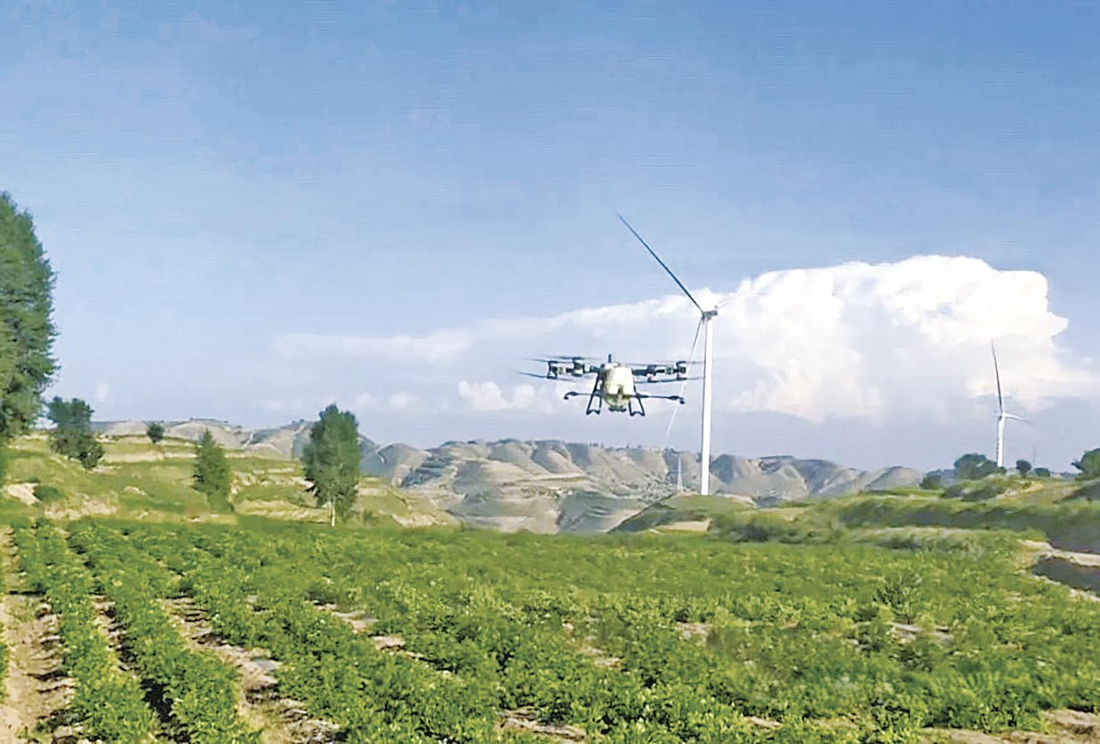 山城鄉(xiāng)八里鋪村1500畝馬鈴薯種植示范基地內(nèi),無(wú)人機(jī)在噴灑營(yíng)養(yǎng)液。