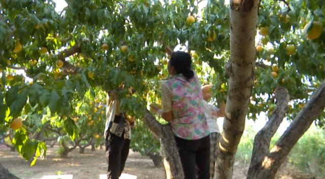 西華池鎮(zhèn)嚴(yán)溝圈村村民嚴(yán)海紅說:“今年這個桃子從七月份開始施肥、澆水,現(xiàn)在桃子到成熟期了,能采摘到八月二十五六號,今年每天產(chǎn)量四五百斤,主要銷往河北一帶,桃價批發(fā)是八毛錢一斤,預(yù)估下來就是一萬斤左右?!?/p>