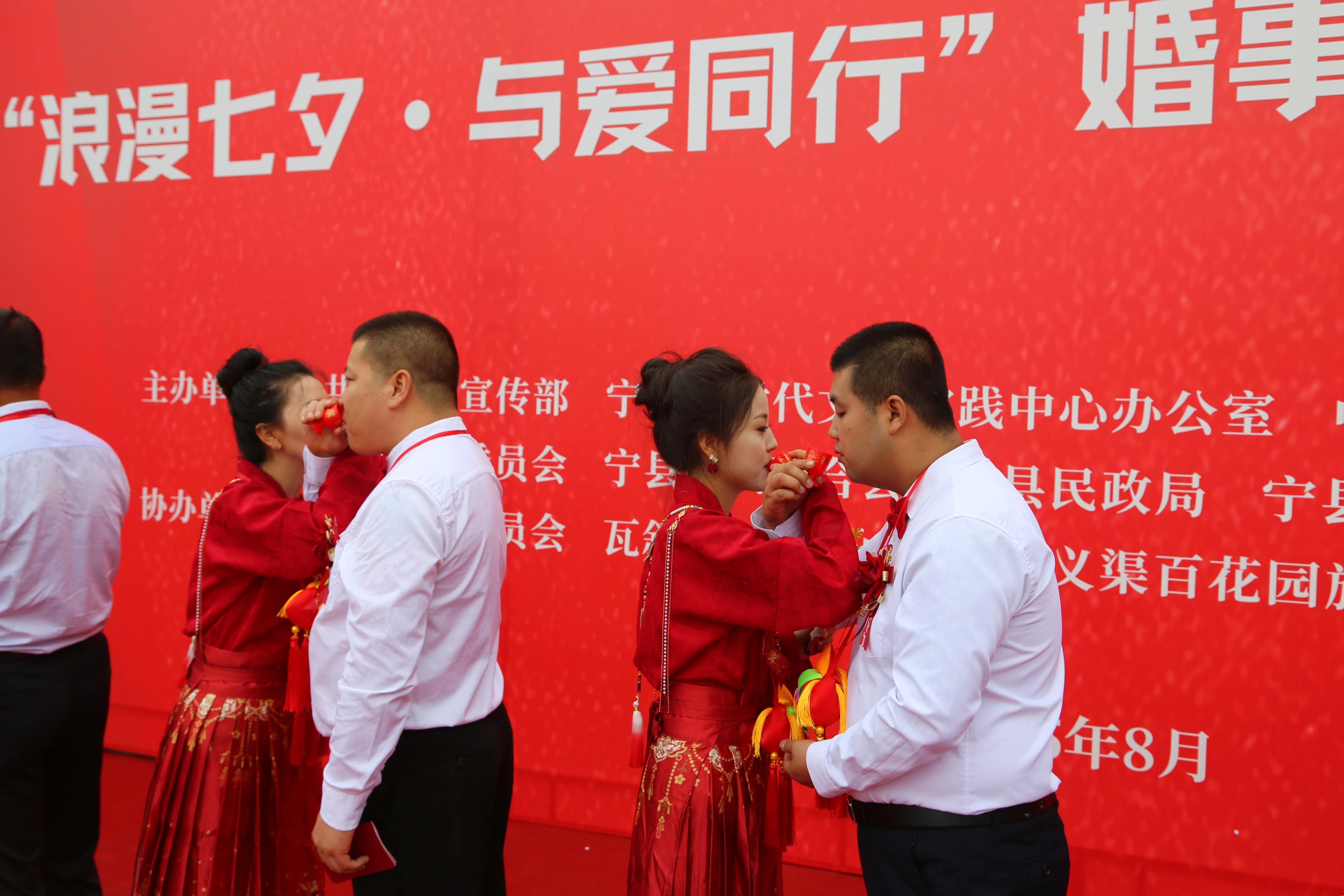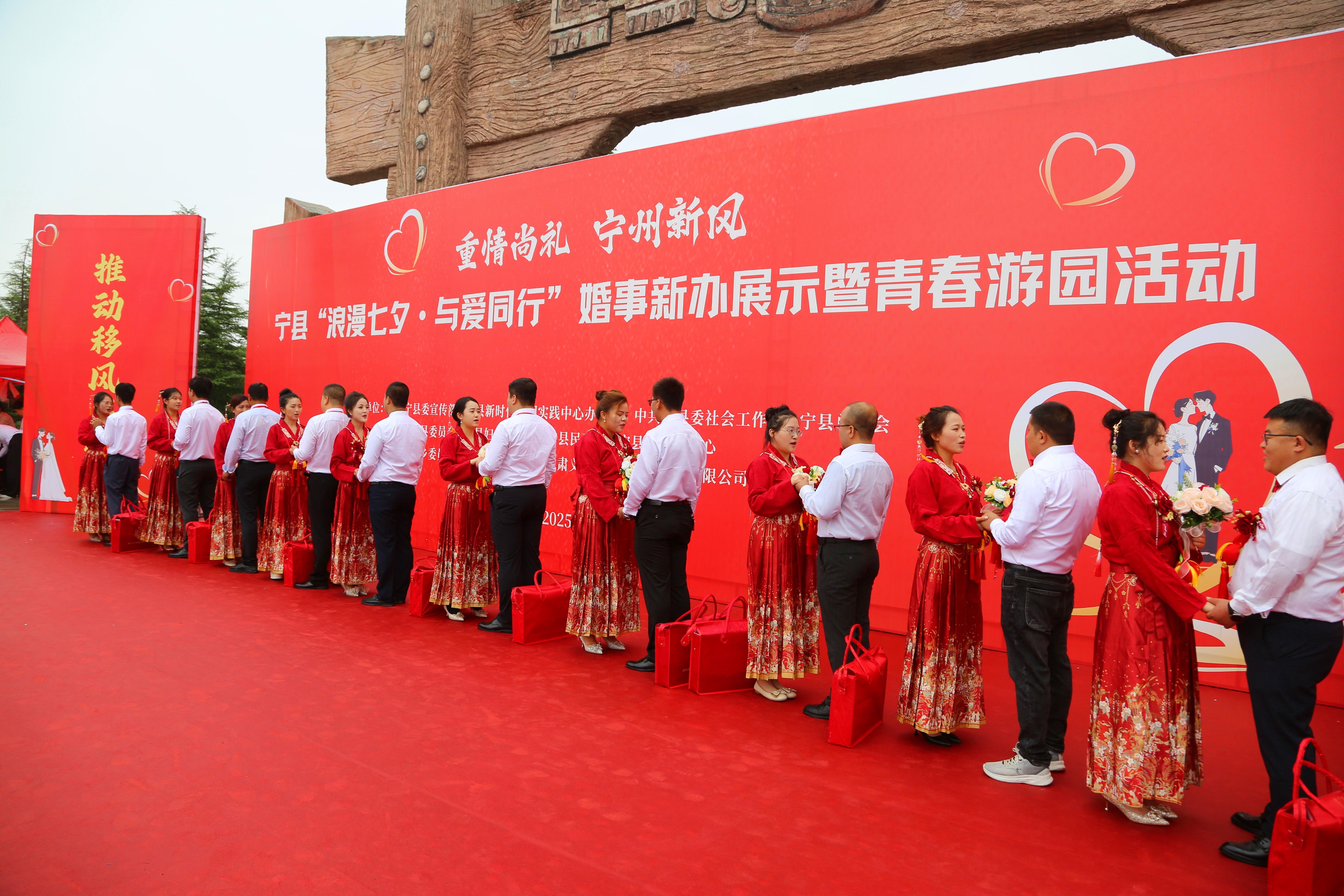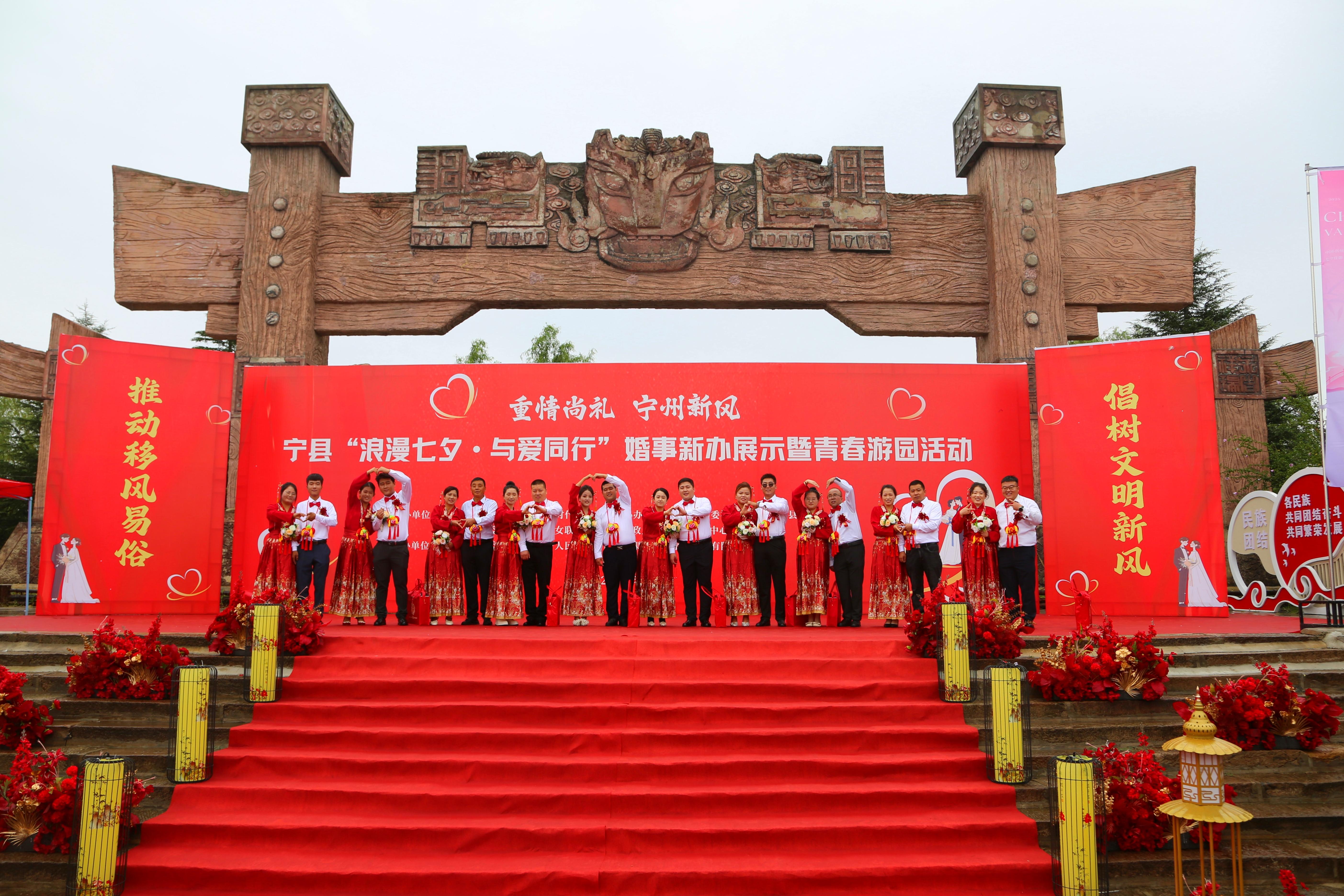 情定義渠花海間,崇尚新風(fēng)共百年。8月28日,七夕佳節(jié)之際,一場(chǎng)以“重情尚禮 寧州新風(fēng)”為主題的“浪漫七夕·與愛同行”婚事新辦展示暨青春游園活動(dòng)在寧縣義渠百花園景區(qū)舉行。10對(duì)新人在親友和當(dāng)?shù)馗刹咳罕姷墓餐娮C下喜結(jié)連理,以實(shí)際行動(dòng)踐行婚俗新風(fēng)尚。