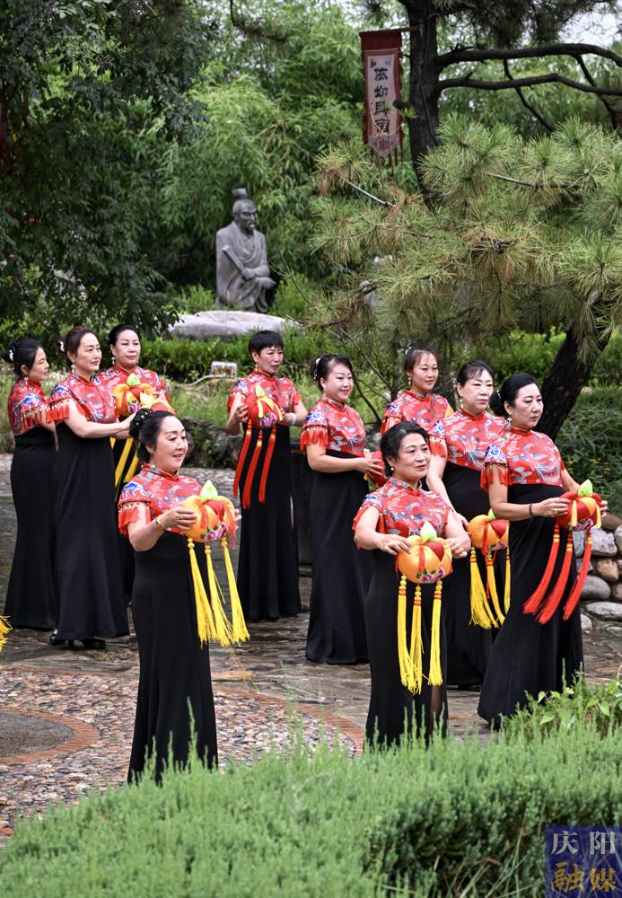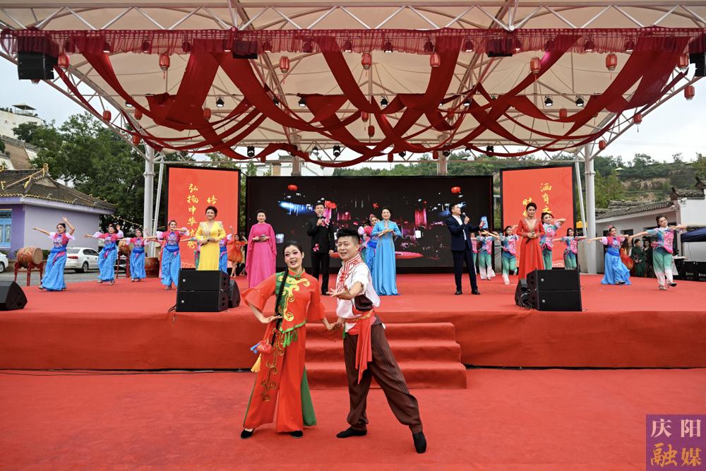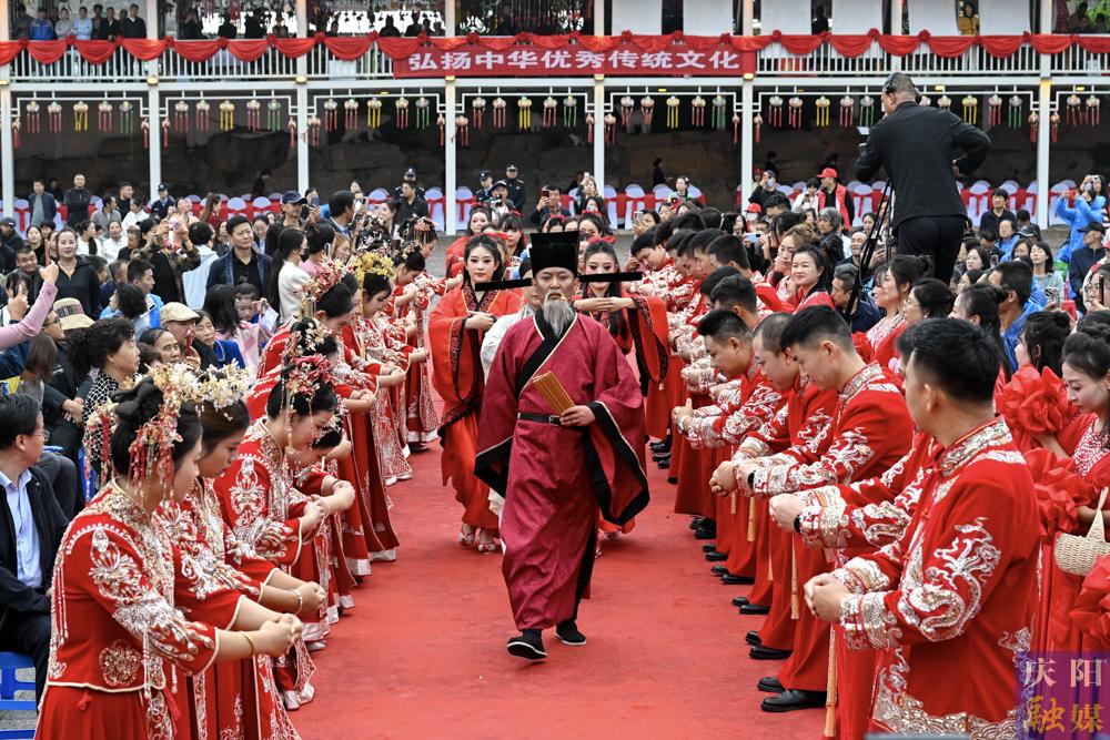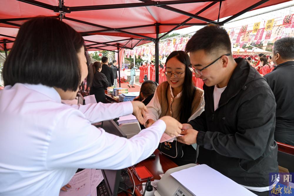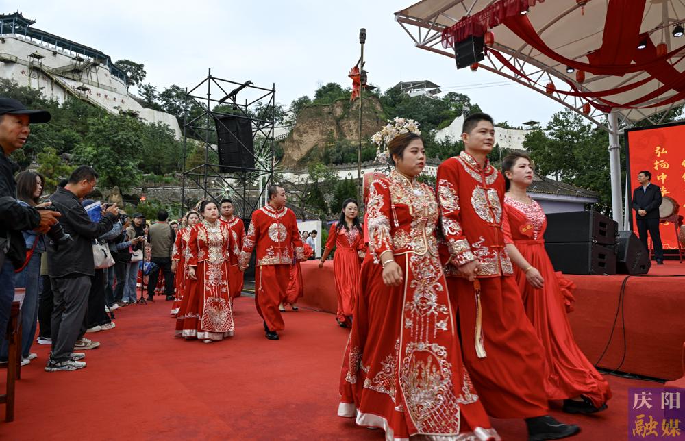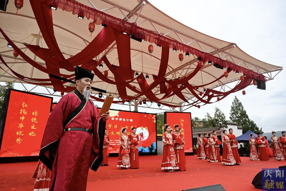 啟動儀式上,新人代表向全社會發(fā)出《抵制高額彩禮 倡樹婚戀新風(fēng)》倡議。隨后,隴東文明婚俗展示暨文藝演出以穿越式情景婚禮為主線,古慶州知州范仲淹“穿越”擔(dān)任主婚人,15對新人行“三拜禮”、飲合巹酒、宣讀文明誓言,省民政廳負(fù)責(zé)同志為新人頒發(fā)結(jié)婚證,與會嘉賓向新人送上“新風(fēng)禮包”祝福。