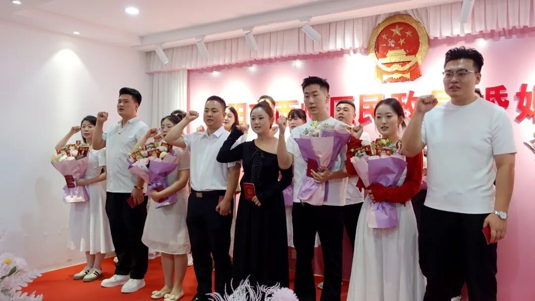 上午九點,區(qū)民政局婚姻登記處洋溢著濃厚的喜慶氛圍,新人們面帶笑容,手捧鮮花,依次填表登記,喜結(jié)良緣?;顒又校橐龅怯浱庁?fù)責(zé)人宣讀了《西峰區(qū)婚俗改革倡議書》,積極倡導(dǎo)健康文明、積極向上的現(xiàn)代文明婚俗新風(fēng)。隨后,區(qū)民政局婚姻登記處為提前預(yù)約登記的10對新人舉辦了集體頒證儀式,為他們頒發(fā)了結(jié)婚證。在眾人的見證下,10對新人緊握右拳,許下愛的誓言。新人代表還表演了詩歌朗誦和歌曲獨唱等節(jié)目,為現(xiàn)場增添了許多喜慶浪漫氛圍。