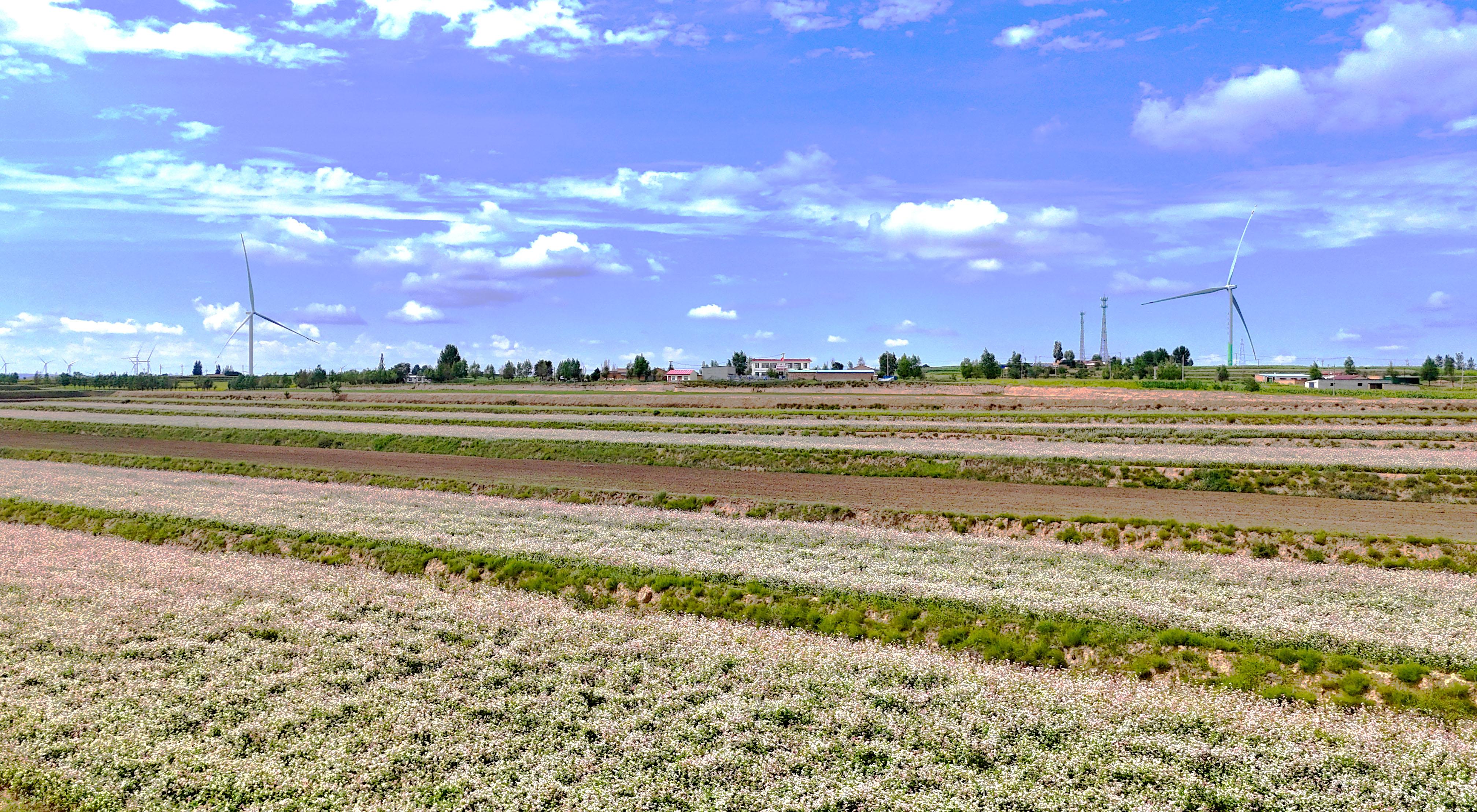 秋風拂過,花簇層層起伏,時而像無數(shù)粉蝶蹁躚,時而如粉色波浪涌動。蜜蜂嗡嗡穿梭其間,淡淡清香漫過山梁,沁人心脾。藍天白云下,蕎麥花海與周邊田野、山巒、大風車相映成趣,既繪就了田園美景,也孕育著豐收的希望。