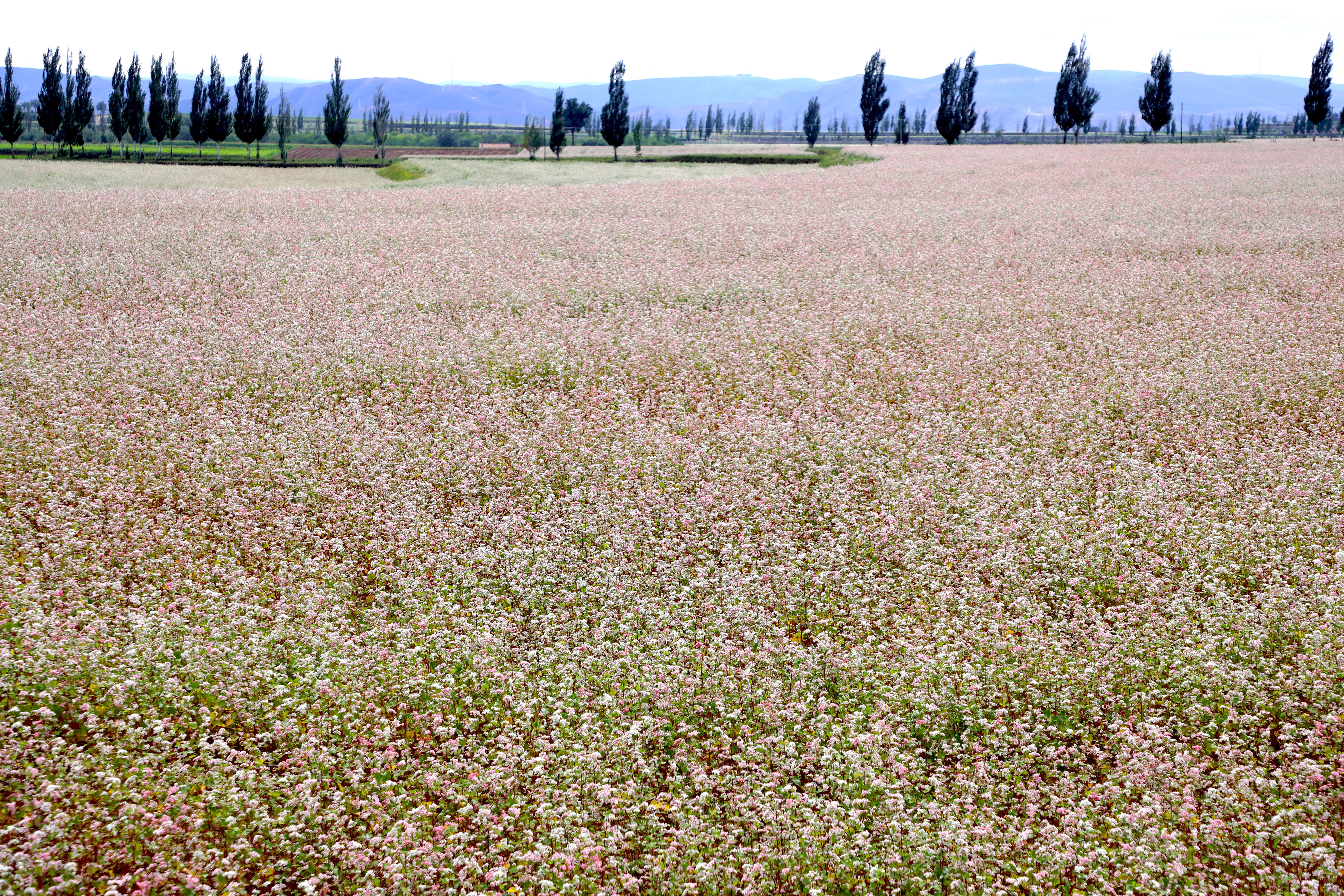 站在西陽洼村塬頂遠眺,連片的蕎麥花肆意綻放。粉白相間的花朵綴在翠綠枝葉間,如繁星點點,又似流云漫卷,隨風搖曳生姿。