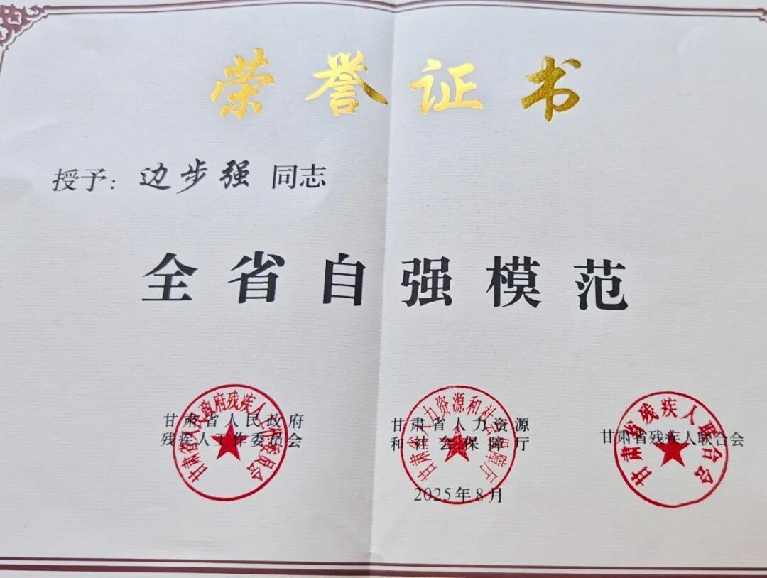 8月28日,第六次全省自強(qiáng)模范暨助殘先進(jìn)表彰大會(huì)在蘭州召開,華池縣殘疾人邊步強(qiáng)榮獲“全省自強(qiáng)模范”稱號(hào)。