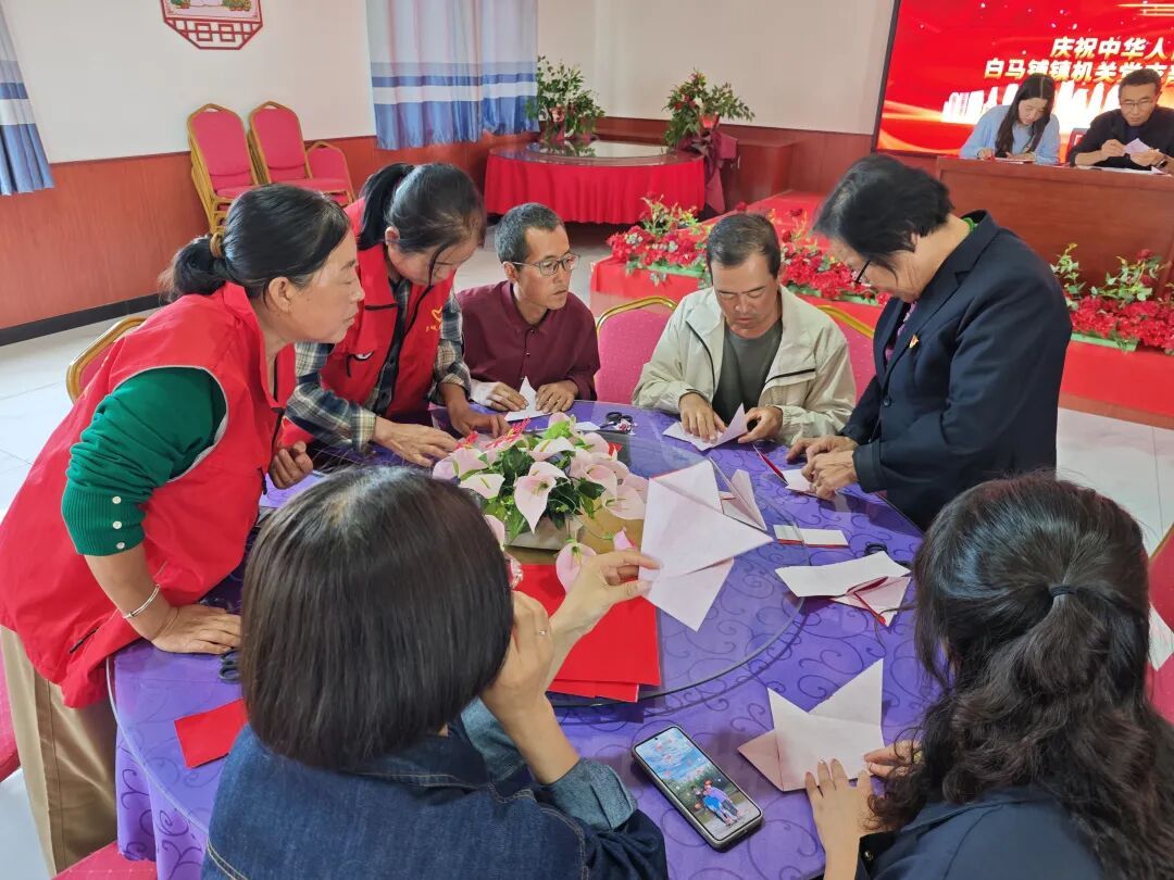 “大家看這張‘黨徽’剪紙,每一個線條都鐫刻著信仰與力量……”為迎接中華人民共和國成立76周年,在九月的主題黨日活動中,白馬鋪鎮(zhèn)機關黨支部與三里店村黨支部聯(lián)合舉辦了一堂別開生面的紅色剪紙微黨課。雪秀梅以“黨員與非遺傳承人”的雙重身份,用剪刀作筆、紅紙為卷,將黨史故事凝于指尖,分享自己用剪紙宣傳黨的政策、服務群眾的故事,樸實話語打動人心,吸引了70余名黨員參與,讓黨史學習從“照本宣科”升級為沉浸式、互動式的文化體驗。