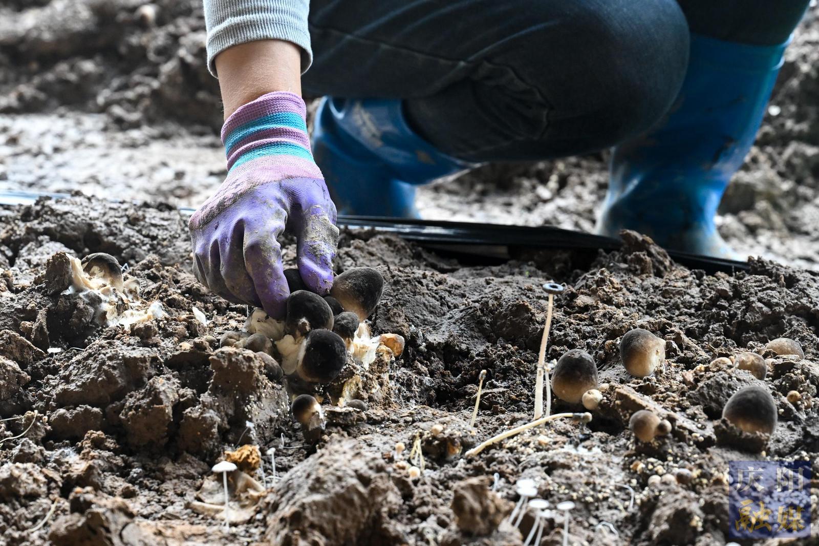 工人采摘草菇。