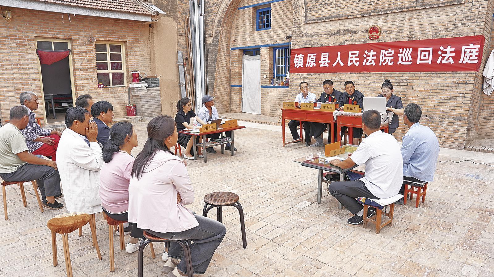 現(xiàn)場調(diào)查、地頭調(diào)解、當(dāng)場履行一氣呵成,在鎮(zhèn)原縣各鄉(xiāng)鎮(zhèn),這種“調(diào)立審執(zhí)訪”五位一體的巡回審判屢見不鮮。席地而設(shè)的巡回法庭,吸引了不少村民前來旁聽,在解決矛盾糾紛的同時,也用老百姓聽得懂的直白語言釋法說理,為大家“沉浸式”普法。