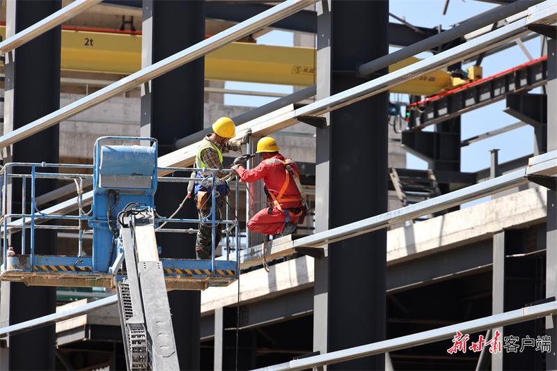 寰泰年產(chǎn)2萬立方米釩電解液及3000噸高純?cè)仙a(chǎn)線項(xiàng)目施工現(xiàn)場(chǎng),工人安裝鋼梁。