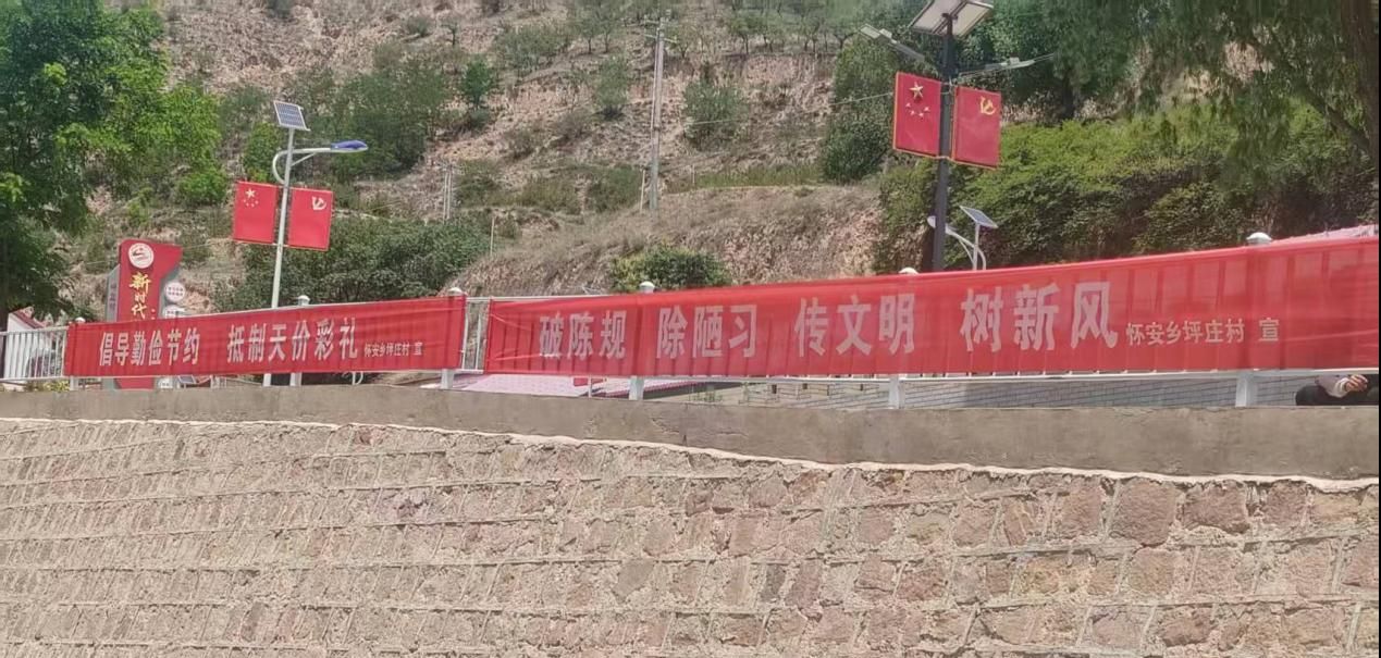 線上,在微信公眾號、視頻媒體號、村民微信群等平臺推送《摒棄陳規(guī)陋習(xí),共建文明懷安—懷安鄉(xiāng)移風(fēng)易俗倡議書》和挖掘選樹出來的抵制高額彩禮、倡導(dǎo)文明新風(fēng)的先進典型事例,用身邊人、身邊事教育引導(dǎo)群眾,形成“崇尚文明、反對陋習(xí)”的良好風(fēng)尚。線下,為8個村統(tǒng)一制作牌匾,逢村民操辦紅白喜事時,由村委會協(xié)調(diào)紅白理事會提前到場,將牌匾擺放于宴席現(xiàn)場顯著位置并現(xiàn)場告知規(guī)定,以作警示引導(dǎo)。牌匾上明確規(guī)定:紅白喜事須登記備案;宴席舉辦時間原則上不超過1天、每桌預(yù)算不超過500元,香煙單價不超過10元,酒水單價不超過80元,禮金原則上不超過100元;2025年彩禮原則上不超過12萬元,2026年不超過10萬元,零花錢不超過1萬元;取消“離娘錢”“壓箱錢”“改口費”等款項。另外,通過張貼標(biāo)語、發(fā)放手冊、懸掛橫幅、舉辦文藝演出等形式,廣泛宣傳移風(fēng)易俗的重要意義和內(nèi)容。行動開展以來,組織文明實踐志愿服務(wù)活動20余場(次),覆蓋群眾1000余人次。