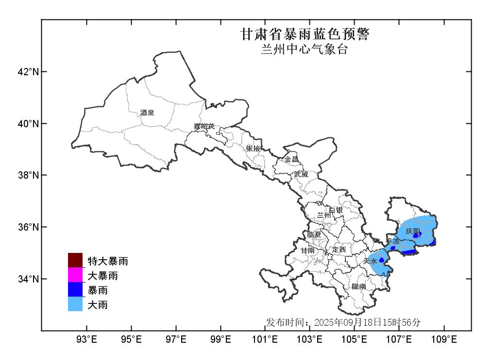 蘭州中心氣象臺2025年09月18日15時56分發(fā)布暴雨藍色預警:過去6小時天水市東部、平涼市東南部、慶陽市東南部已出現(xiàn)50毫米以上累積降水,預計未來12小時我省天水市中東部、平涼市中南部、慶陽市中南部有大雨,其中天水市東部、平涼市東南部、慶陽市中部和東南部局部地方有暴雨,雨量可達50毫米以上。請注意防范降水與前期降水疊加效應可能引發(fā)的中小河流洪水、城鄉(xiāng)積澇、山洪、滑坡和泥石流等次生災害。