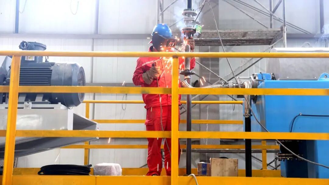 華池油田工業(yè)廢棄物資源生態(tài)處理項(xiàng)目現(xiàn)場(chǎng),工人在焊接圍欄。 通訊員 孫丹 攝
