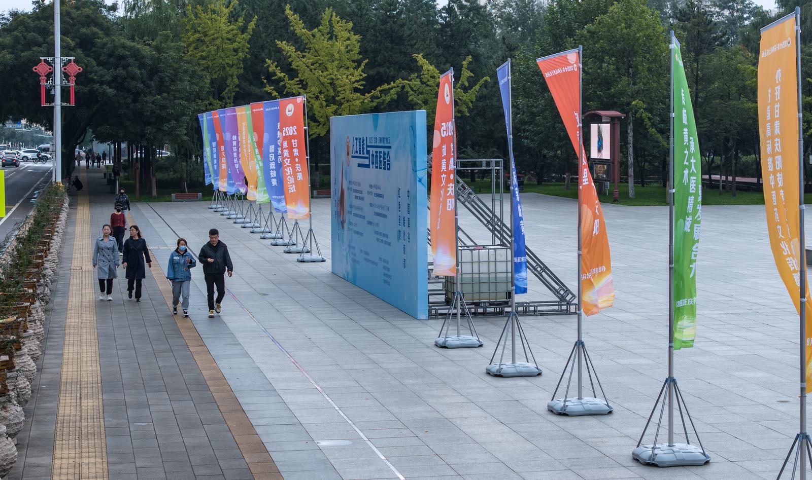 西峰區(qū)和諧廣場展板、道旗整齊排列。