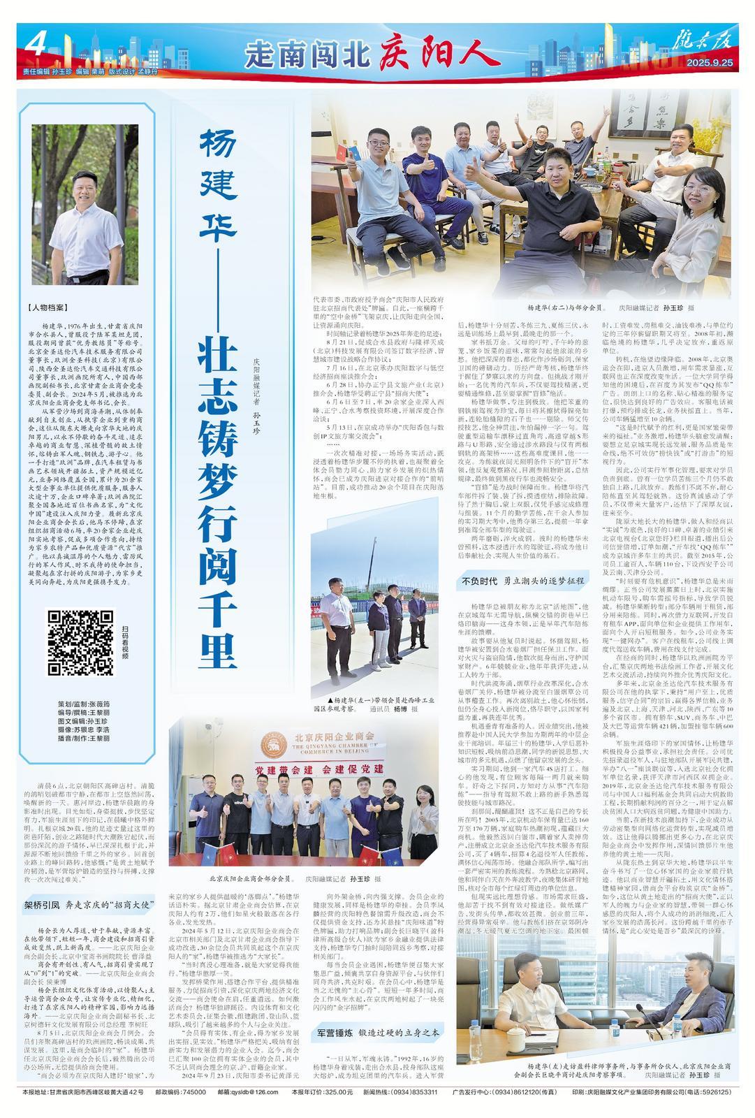 從隴東熱土到京華大地,楊建華以半生奮斗書寫了一位心懷家國的企業(yè)家前行軌跡。他以商業(yè)智慧開疆拓土,用文化情懷搭建精神家園,借商會平臺構(gòu)筑京慶“金橋”。如今,這位從黃土地走出的“招商大使”,正以軍人的魄力與企業(yè)家的智慧,帶領(lǐng)一群心懷感恩的慶陽人,將個人成功的涓涓細流,匯入家鄉(xiāng)發(fā)展的浩蕩長河。這份跨越千里的赤子情懷,是“此心安處是吾鄉(xiāng)”最深沉的詮釋。