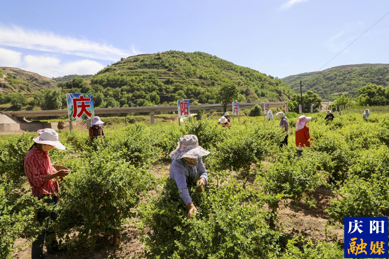 華池縣恒烽中藥材苗林有限公司組織藥農(nóng)采摘金銀花。