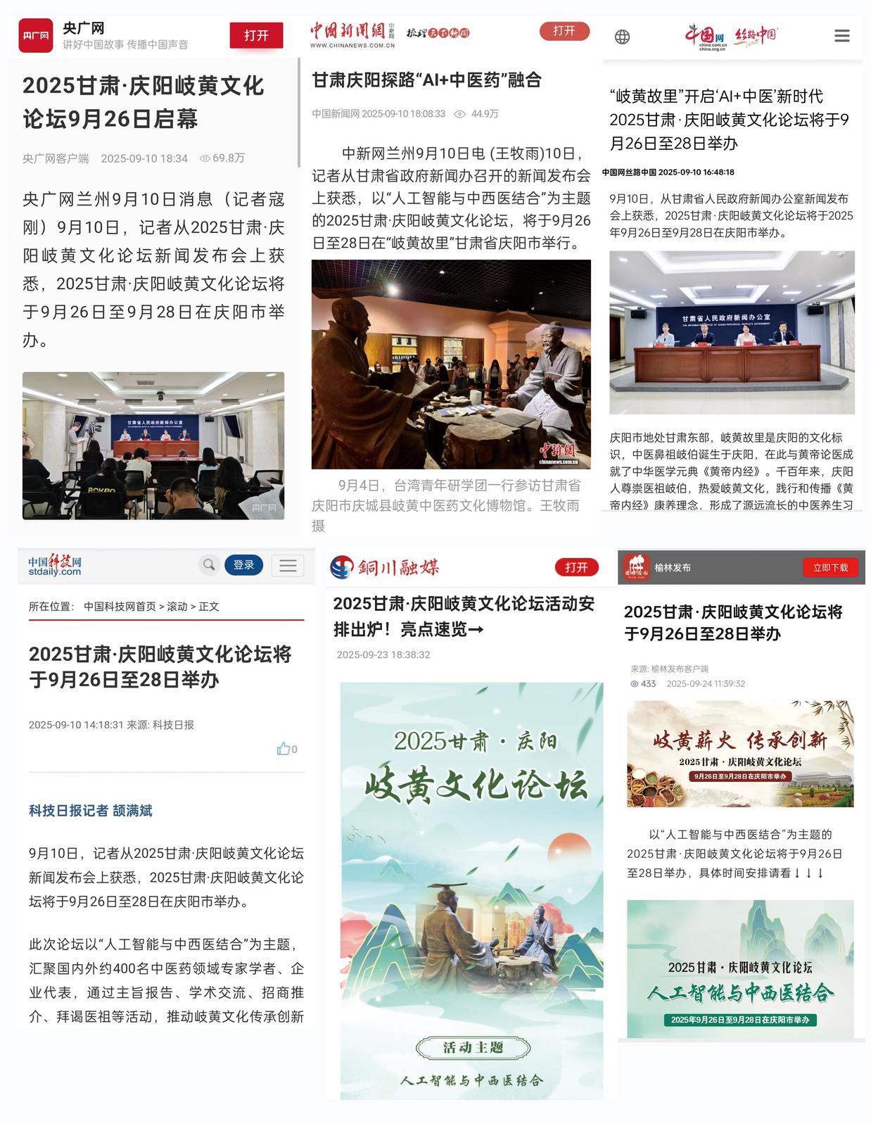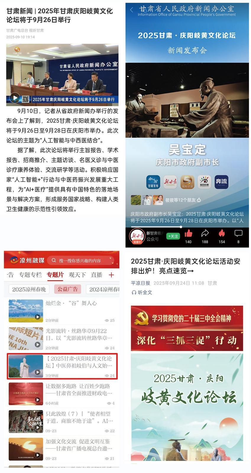 在省內(nèi)傳播層面,形成“省級(jí)媒體引領(lǐng)+市州融媒聯(lián)動(dòng)”的強(qiáng)大合力。甘肅日?qǐng)?bào)、甘肅經(jīng)濟(jì)日?qǐng)?bào)、甘肅農(nóng)民報(bào)等省級(jí)主流媒體,及新甘肅客戶端、每日甘肅網(wǎng)、奔流客戶端等新媒體平臺(tái),圍繞“人工智能與中西醫(yī)結(jié)合創(chuàng)新發(fā)展”“岐黃文化傳承實(shí)踐”等核心主題,密集推出40多篇深度稿件、10幅主題海報(bào)、15條精品視頻,并開展2場(chǎng)實(shí)時(shí)直播,既傳遞論壇信息,更全面解讀慶陽(yáng)作為岐黃文化發(fā)祥地的深厚底蘊(yùn)與產(chǎn)業(yè)創(chuàng)新實(shí)踐。同時(shí),省內(nèi)14個(gè)市州融媒同步聯(lián)動(dòng)轉(zhuǎn)發(fā),讓慶陽(yáng)岐黃文化在甘肅省內(nèi)形成“全域覆蓋、同頻共振”的傳播效應(yīng),進(jìn)一步夯實(shí)省內(nèi)文化影響力基礎(chǔ)。