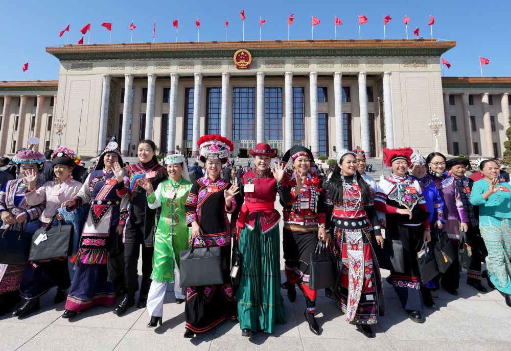 2024年3月8日,十四屆全國人大二次會議第二次全體會議結(jié)束后,女代表在北京人民大會堂前合影留念。人大代表中婦女代表比例不斷提升。2023年第十四屆全國人大婦女代表790人,占26.5%,比第十二屆、十三屆分別提高3.1個、1.6個百分點(diǎn)。