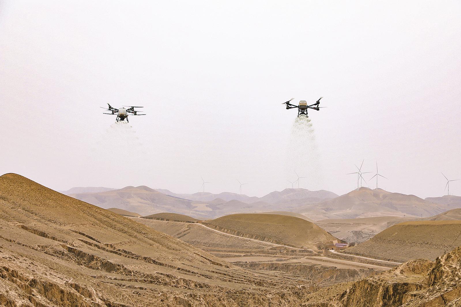 甜水鎮(zhèn)魯掌村利用無人機(jī)播撒草籽。 慶陽(yáng)融媒記者 喬潔 攝