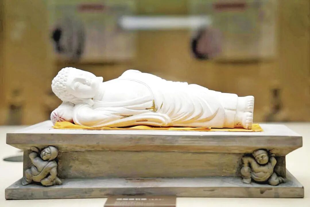收藏單位:隴東古石刻藝術(shù)博物館 螺髻,面相方圓飽滿,五官俊秀,身著通肩大衣,下著裙,左側(cè)臥,左手曲肢托于頭部,右手平放體上,右腿彎曲,左腿直伸,安詳長(zhǎng)眠。