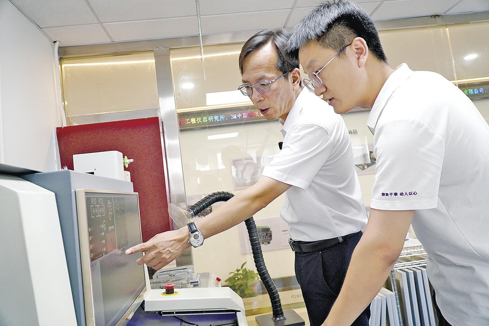 栗旭錦(左)與公司總經(jīng)理李鵬真探討設(shè)計(jì)研發(fā)方案。 慶陽(yáng)融媒記者 孫玉珍攝