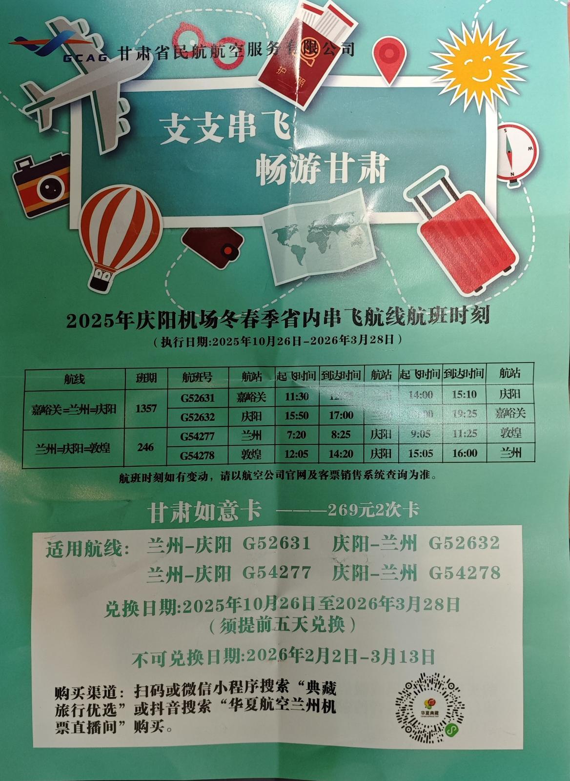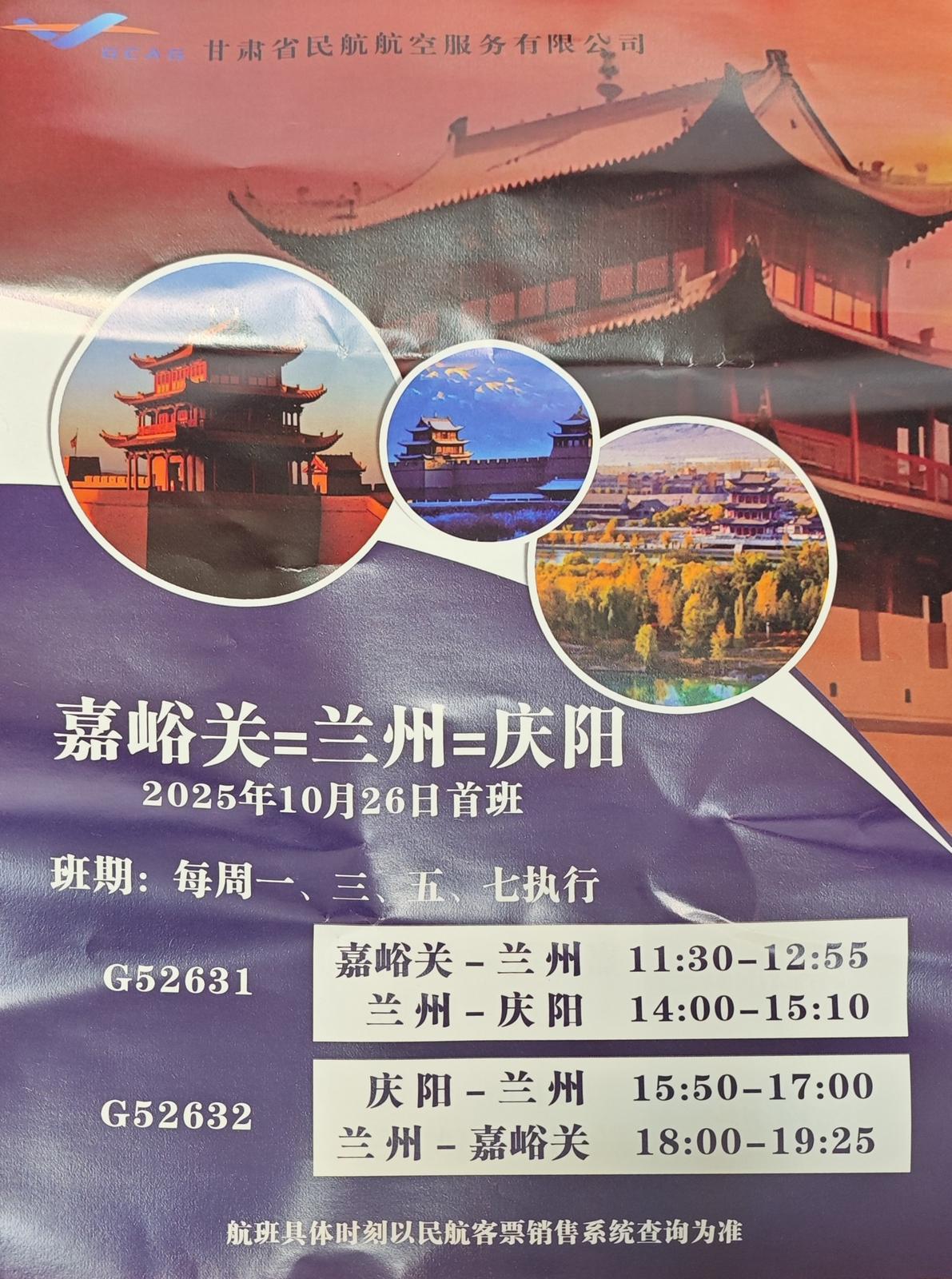 據(jù)悉,慶陽機(jī)場(chǎng)2025年冬航季將于10月26日至2026年3月28日?qǐng)?zhí)行,共計(jì)劃運(yùn)營9條航線。其中,新增嘉峪關(guān)=蘭州=慶陽(每周1、3、5、7執(zhí)飛)、蘭州=慶陽=敦煌(每周2、4、6執(zhí)飛)2條航線,同步平移7條原有航線,進(jìn)一步完善區(qū)域航線網(wǎng)絡(luò)。