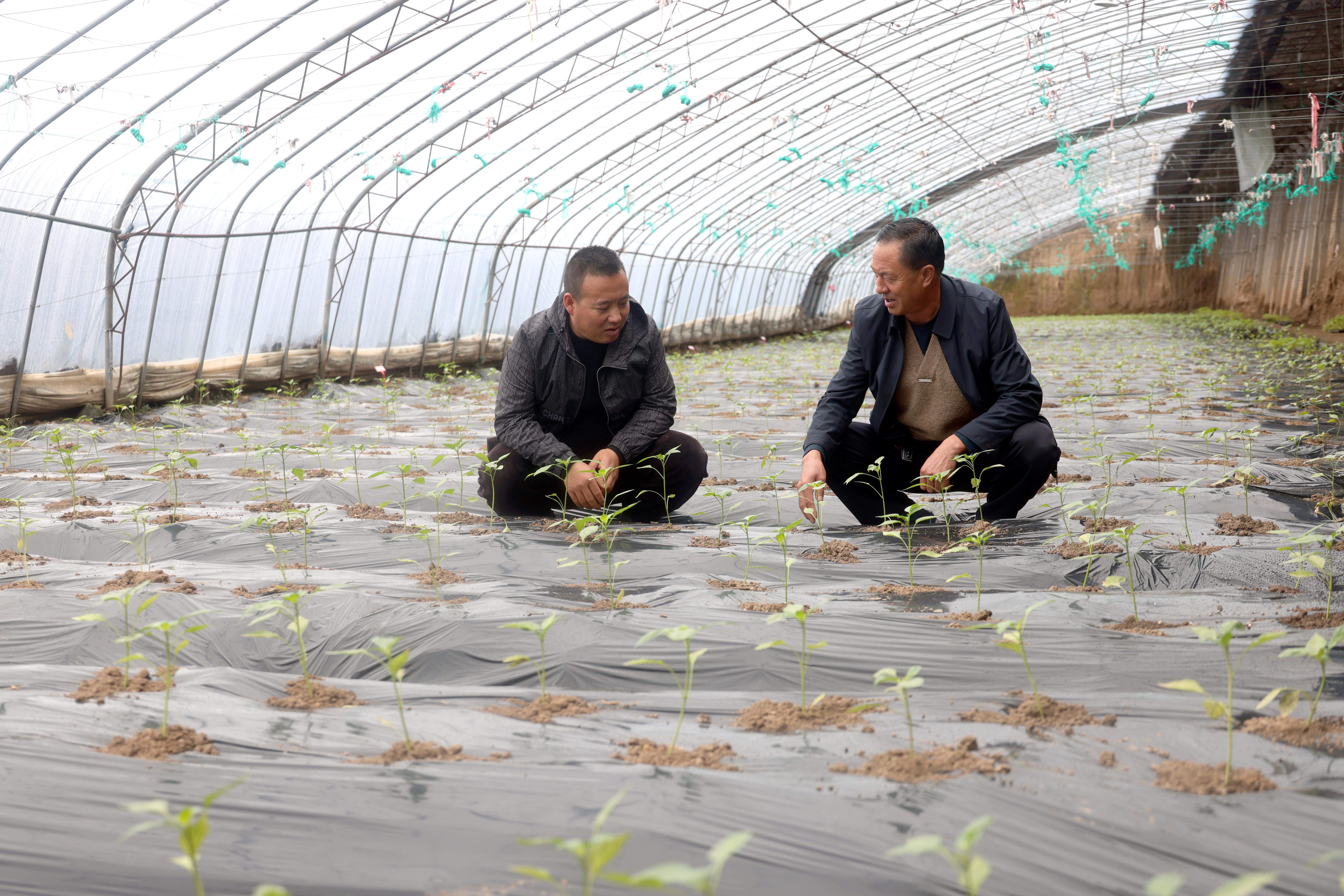 慶陽萬潤園種植養(yǎng)殖農民專業(yè)合作社理事長(右)和社員查看辣椒長勢。盤小美 攝