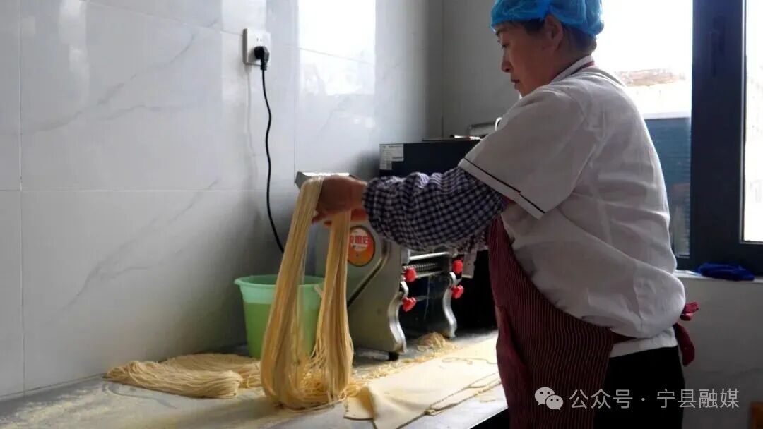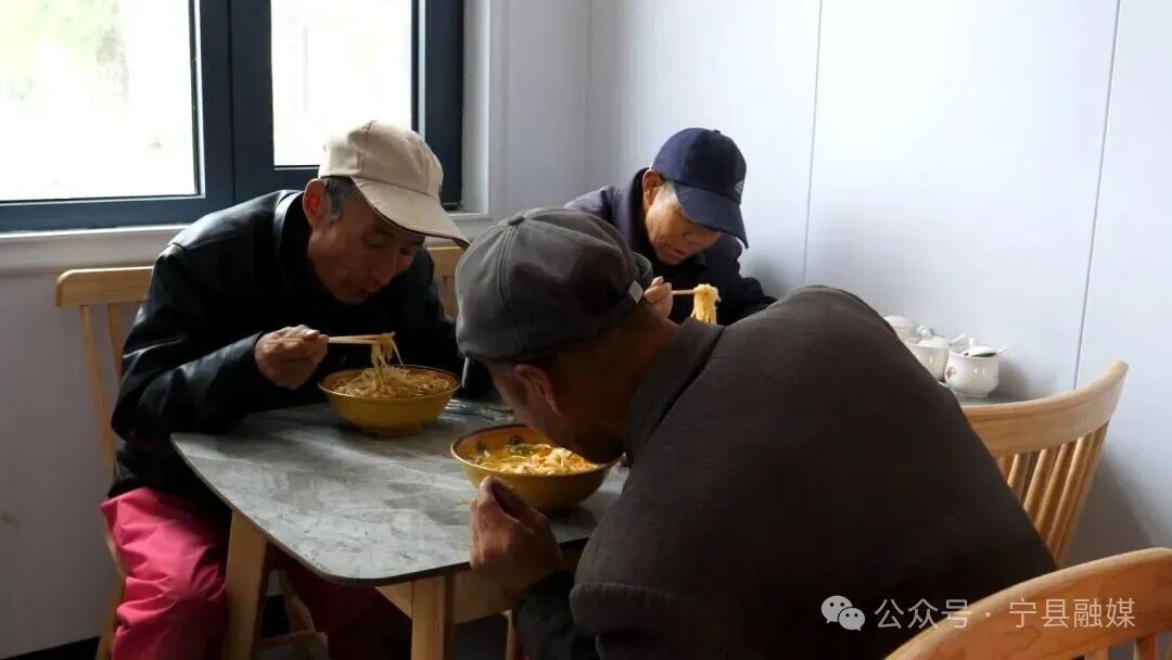 中午時(shí)分,走進(jìn)寧縣中村鎮(zhèn)平定村的“百姓餐廳”,廚房里廚師正忙著和面、壓面,準(zhǔn)備著午餐的配菜。不一會(huì)兒,鍋中就飄出陣陣飯菜香。當(dāng)天的午餐是油餅、洋芋糊糊面和炒菜。老人們圍坐在餐桌旁,一邊津津有味地享用,一邊閑話家常,場(chǎng)面溫馨而熱鬧。