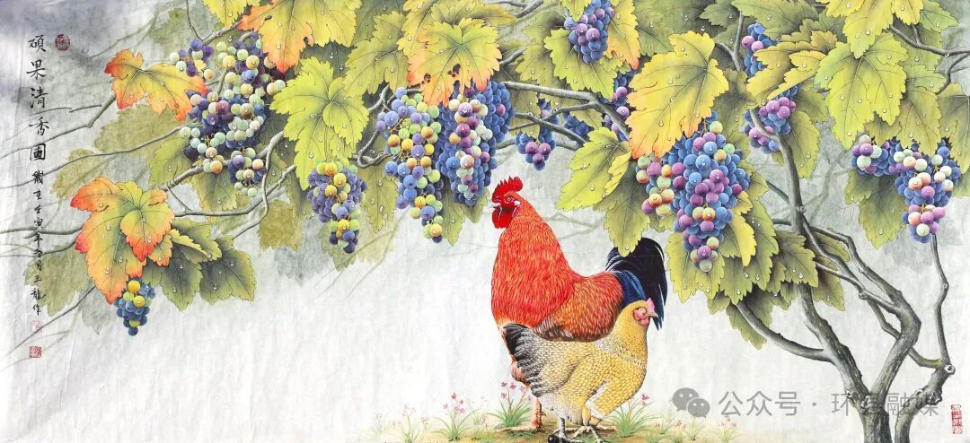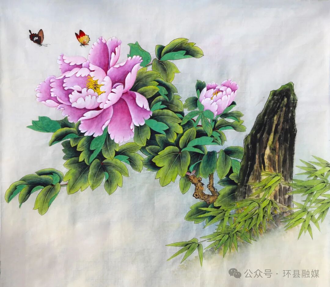 他的作品構(gòu)圖飽滿大氣,色彩鮮明靈動,筆法酣暢灑脫,既飽含著濃郁的鄉(xiāng)土氣息與生活溫度,又彰顯著獨(dú)特的藝術(shù)視角與深厚筆墨功底,形成了獨(dú)具一格的“鄉(xiāng)土寫實(shí)”風(fēng)格——筆下牡丹艷而不俗、層次分明,葡萄顆顆飽滿、晶瑩欲滴,山水畫則盡展隴東大地的雄渾磅礴。