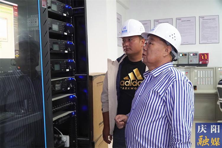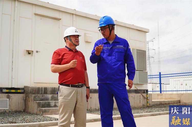 ▲趙發(fā)榮(左)在奇點(diǎn)匯能儲(chǔ)能電站了解情況。