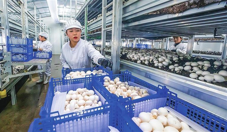 甘農(nóng)蘑力食用菌全產(chǎn)業(yè)鏈雙孢菇標(biāo)準(zhǔn)化生產(chǎn)基地,工人采摘雙孢菇。李卿