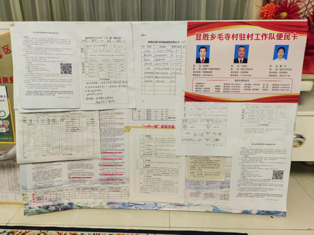 墻上的A4紙已經(jīng)覆蓋好幾層,包含駐村工作隊便民卡、防止返貧監(jiān)測對象申報政策明白紙、脫貧戶“一戶一策幫扶計劃”等內(nèi)容,且被不同顏色的筆標識,記錄著家里基本情況、收入構(gòu)成、扶持政策、幫扶舉措等內(nèi)容。